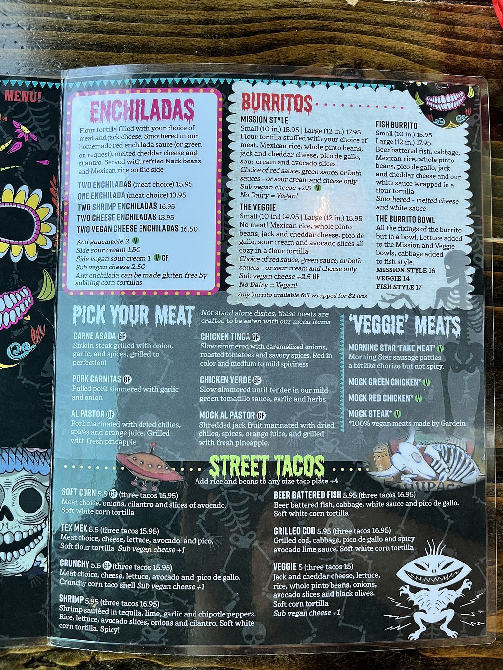 The vegan chimichangas are so good, I can't get myself to order anything else. They offer vegan sour cream on the side. Our meals here get pricey (by our standards) with all the vegan sub add-ons like cheese and faux meat.