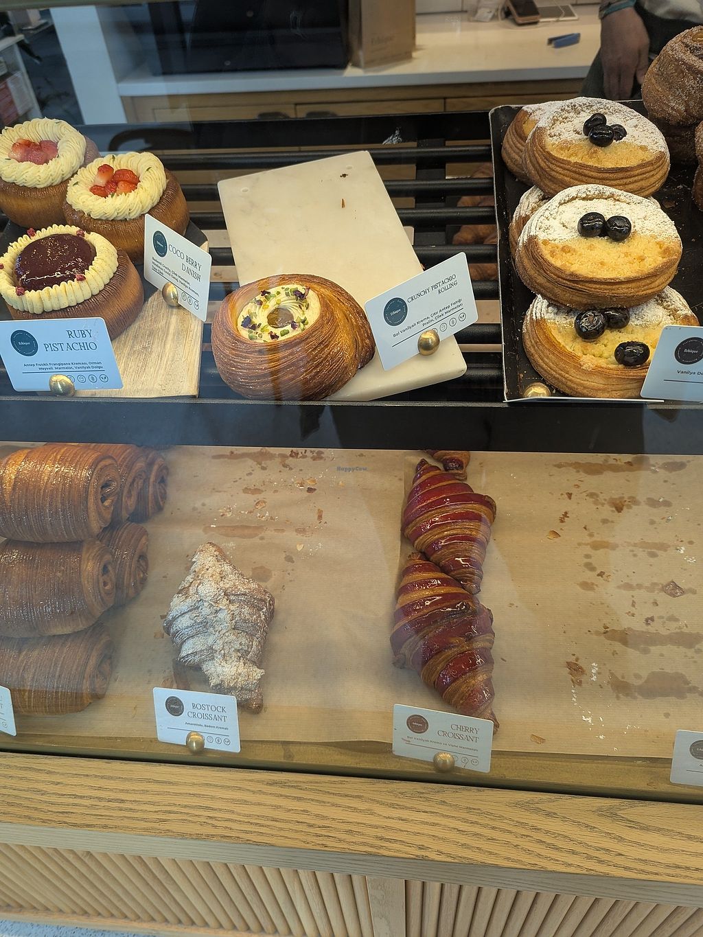 So many mouth watering desserts i wanted to try them all! Really elegant. The food options are good too, mostly sandwiches. I had an harissa croissant it was good and i even struggled to finish it. Problem, its expensive and not central at all!