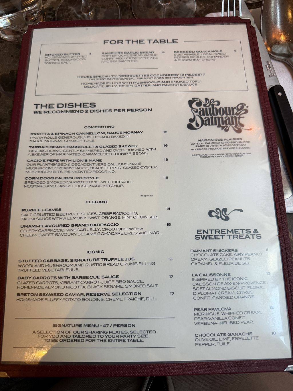 Good for a unique French experience. Portions are a bit small for the price. Their other location Daimant Saint-Honoré is better in terms of both food quantity and quality.
