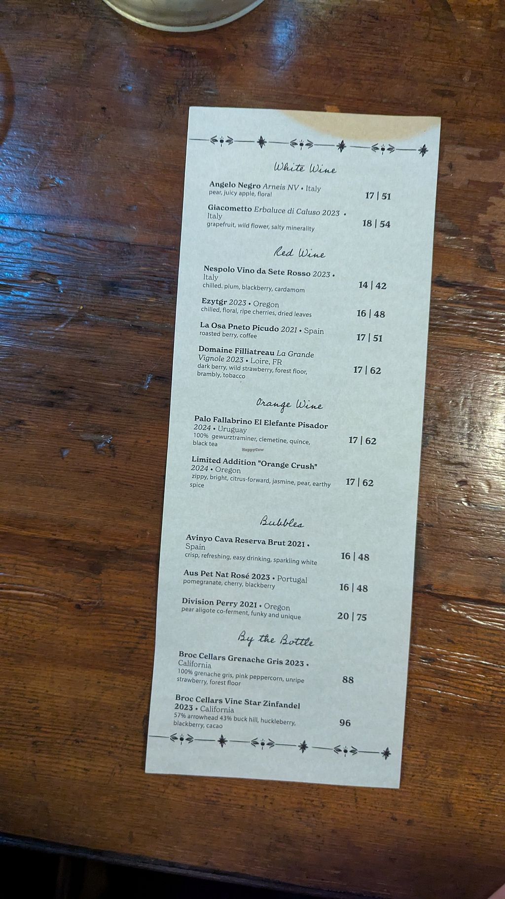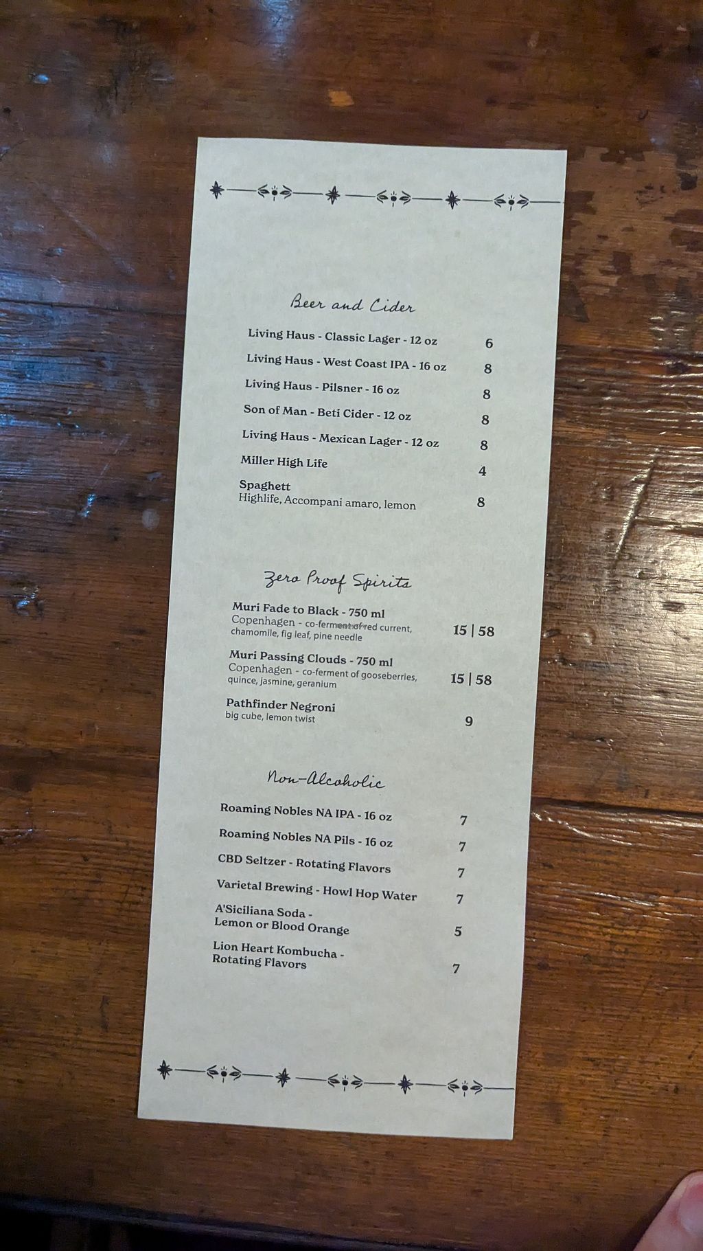 Everything is delicious and fresh. We’ve been here maybe a dozen times this summer, for dinner and brunch, and almost every meal has blown our socks off (the singular exception being the coffee at brunch, which is just okay for someone who prefers a 70:30 ratio with oatmilk). The non-alcoholic cocktails are INCREDIBLE! The atmosphere is cozy and romantic, but without being too self-important. Best for smaller parties - might be okay with a large (6 ) crowd if you plan ahead and reserve. Walk ins for 1-2 people are easy - we’ve never had to wait more than a few minutes without a reservation… though we usually go late (and they might run out of some dishes). The people are such a delight and service is top notch. Can’t recommend enough!