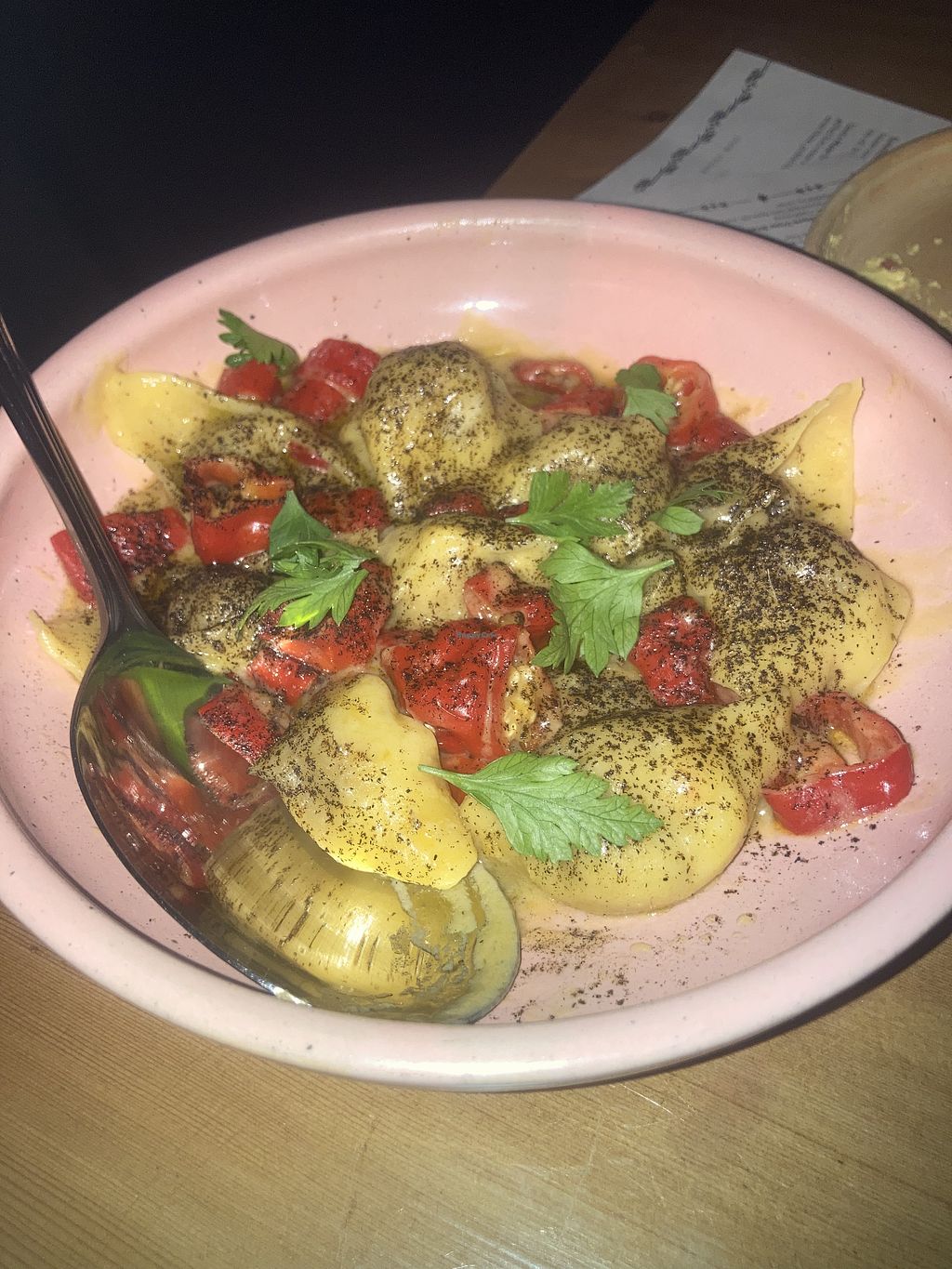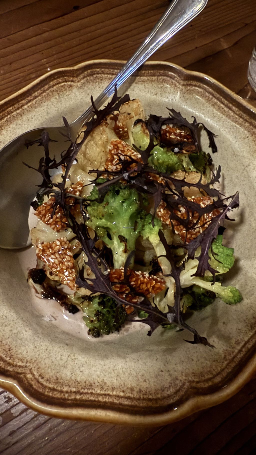 We made a reservation for dinner, which I recommend, as space fill up fast. We tried the grilled focaccia with black garlic butter, the smoky collard greens, the masa dumplings (chochoyotes) and the seitan schnitzel. The collard greens were absolutely amazing—smoky, tangy and the fried onions gave them a delicious crunch! The other dishes were just ok. The schnitzel was kind of tough to cut. The sauce on it was really good but there wasn’t enough to cover it. The dumplings also had a really flavorful sauce, but didn’t have much flavor themselves. The bread was a tasty sourdough focaccia but my partner didn’t like how it had been cut (sliced from the top but now the whole way so you had to awkwardly tear it, but it didn’t tear through the crispy bottom). Overall the food was okay, but we expected more. We might give them another chance in the future. But for fine dining, I would recommend Astera.