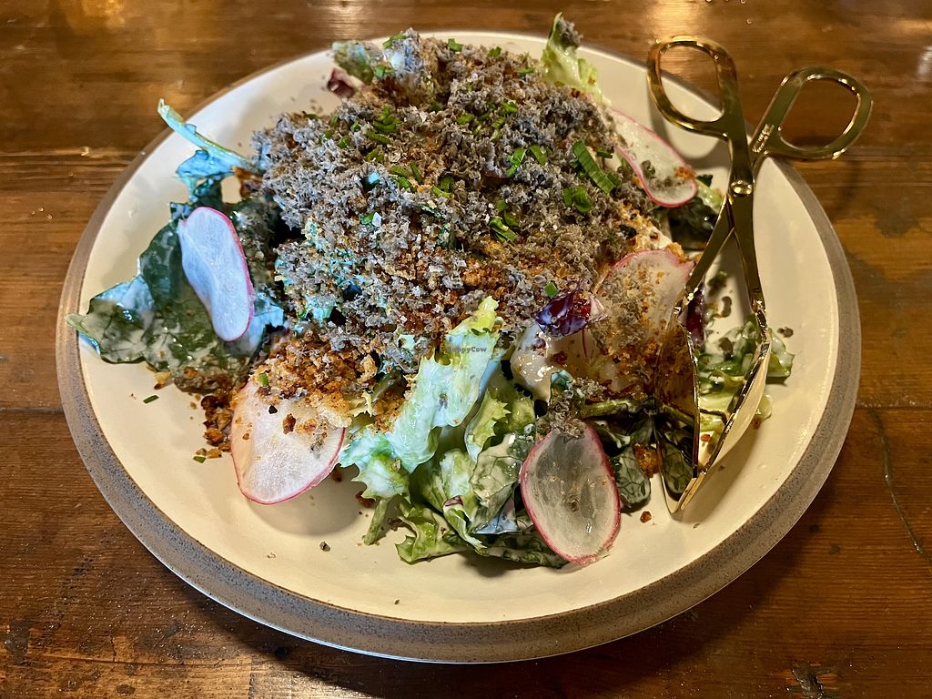 Read moreThe Chicory Salad included apple slices, shaved white vegan cheddar, parsley, and pear and quince vinaigrette. At first, I was confused why it was served with a knife. I quickly realized the knife was necessary because the chicory was not cut up. It was annoying and cumbersome to try to cut it in the small bowl. I liked the flavor of the cheese, but there was too much smothered on top of the salad. I also liked the dressing, but it couldn't mask the bitterness of the chicory. Overall, not for me. However, my partner enjoyed the Hot Kimchi-Fried Tofu Sandwich.