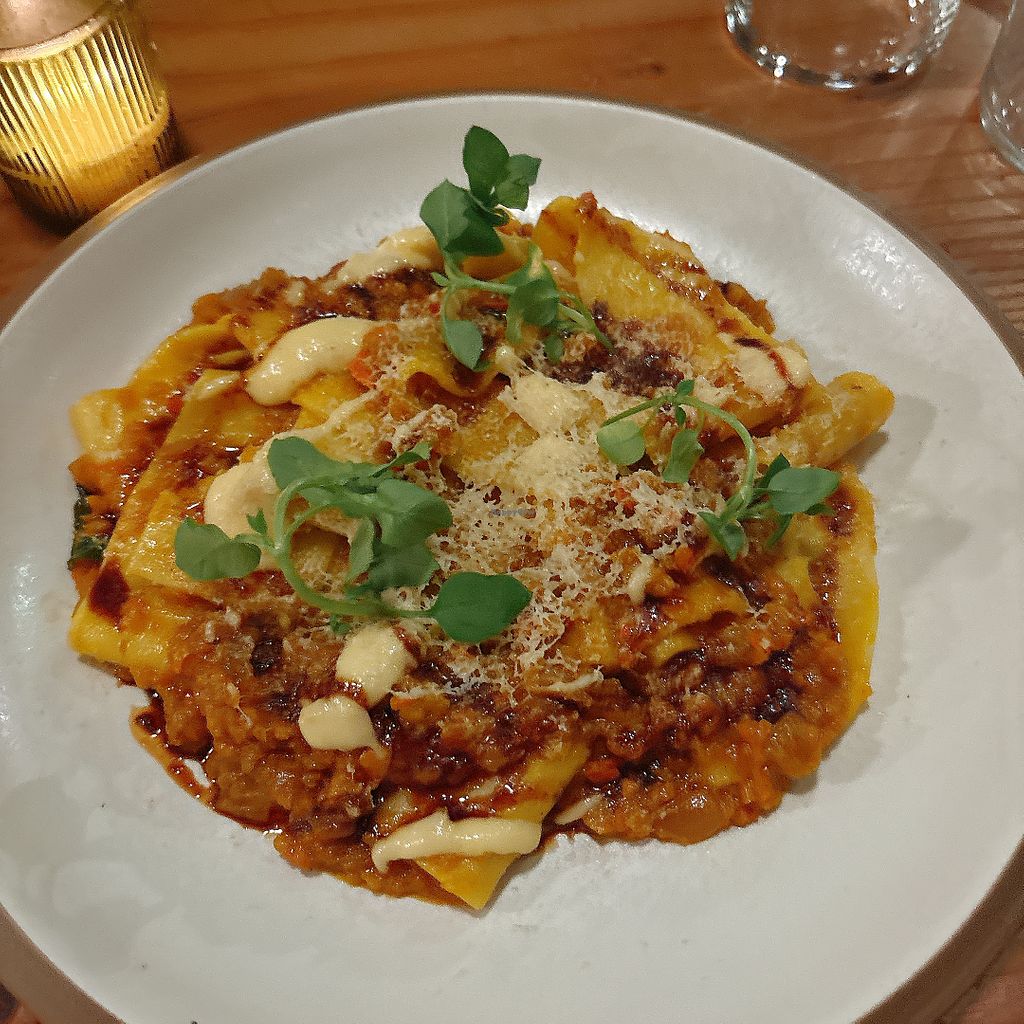I had the Papardelle which is a wide, flat pasta with a rich, lasagna-like meat sauce. It was piquant and so delicious!😋 Foccacia came with a bright citrus tang and garlic and I loved it!