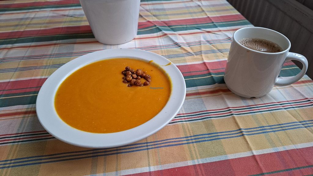 Lunch changes every day but today I had soup and a buffet salad with a range of breads and grains. Really tasty and included coffee and tea in the price. Staff spoke English and people were friendly. Really good value for money.