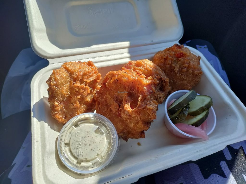 Fully vegan food vendor serving mushroom-focused comfort food at Grand Lake Farmer's Market. Sells crab cakes, fried mushroom chicken sandwiches, Philly cheesesteaks, loaded fries, and more. Open Sat 9:00am-2:00pm.