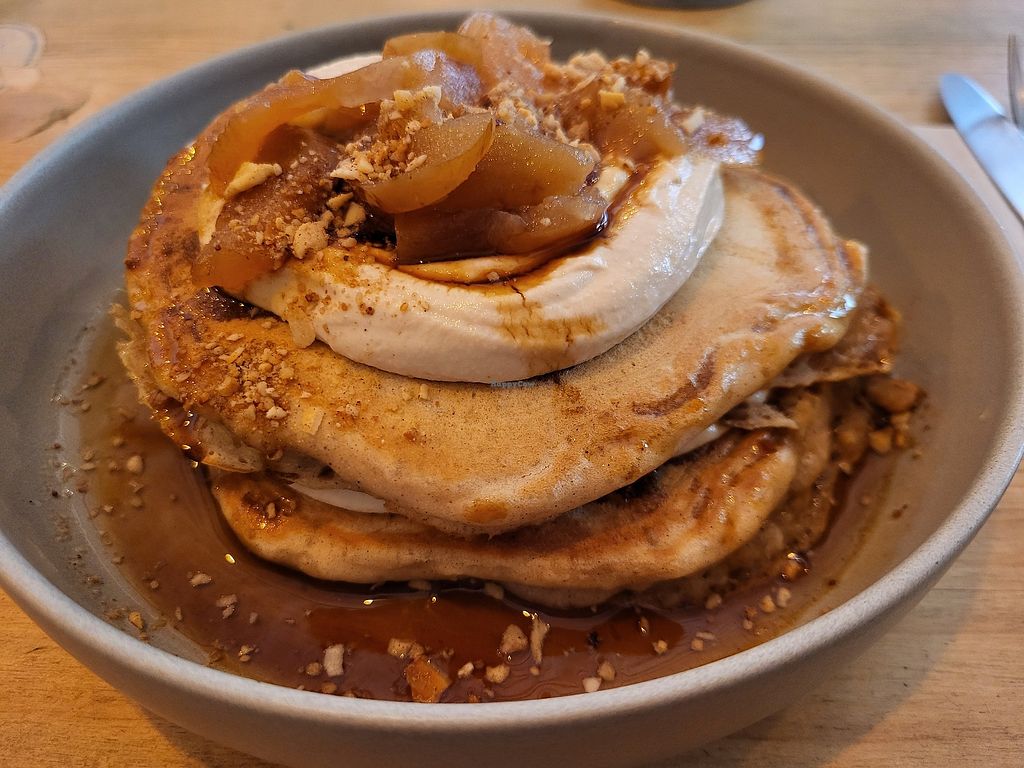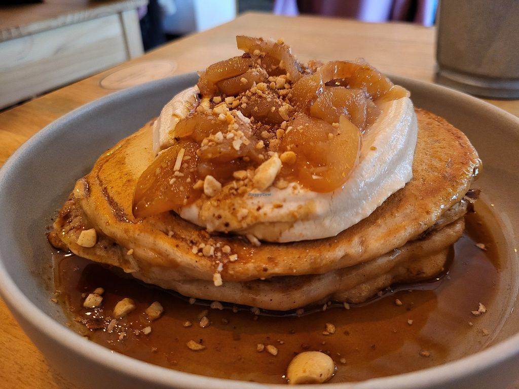 From the warm welcome to the decadent food, everything was perfection. I ordered the apple pancakes which were very yummy. I was originally apprehensive that only 2 pancakes would fill me, but it proved to be a hefty portion since they also fill a layer between pancakes with more apples and top with cashew cream cheese which was on the savory side to balance out the sweetness of the apples. I'll be back soon to try the sandwiches which looked scrumptious.