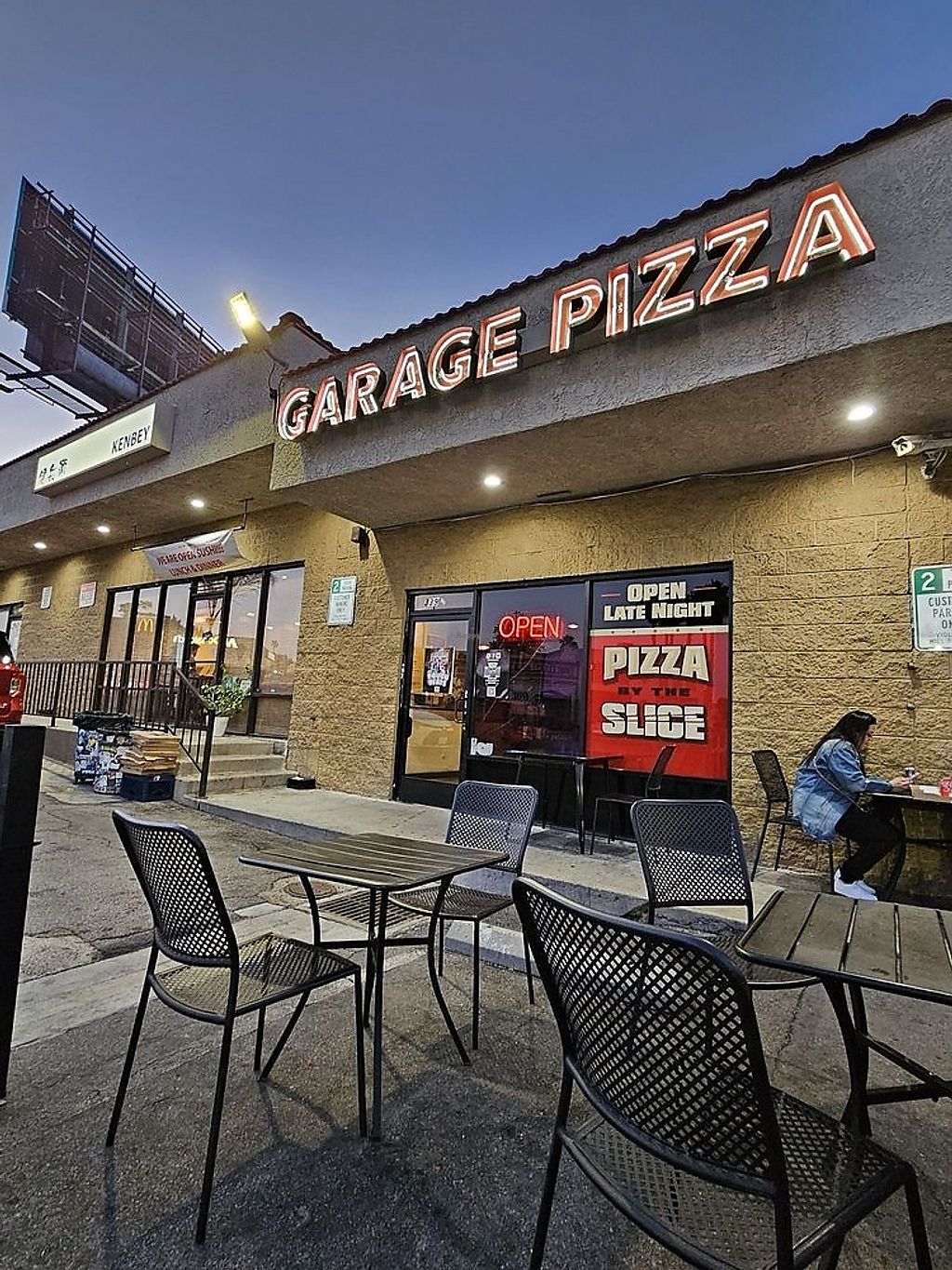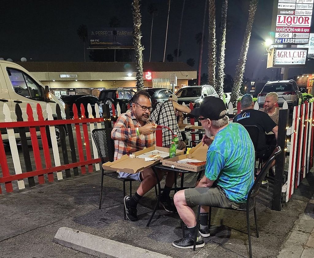Went at midnight and had incredible East Coast style pizza (hard to find in LA!) Thin and crispy! They use follow your heart cheese. I got the vegan pepperoni and it was nice and spicy (not sure of the brand). No seating inside, but they have a few tables set up in the parking lot.