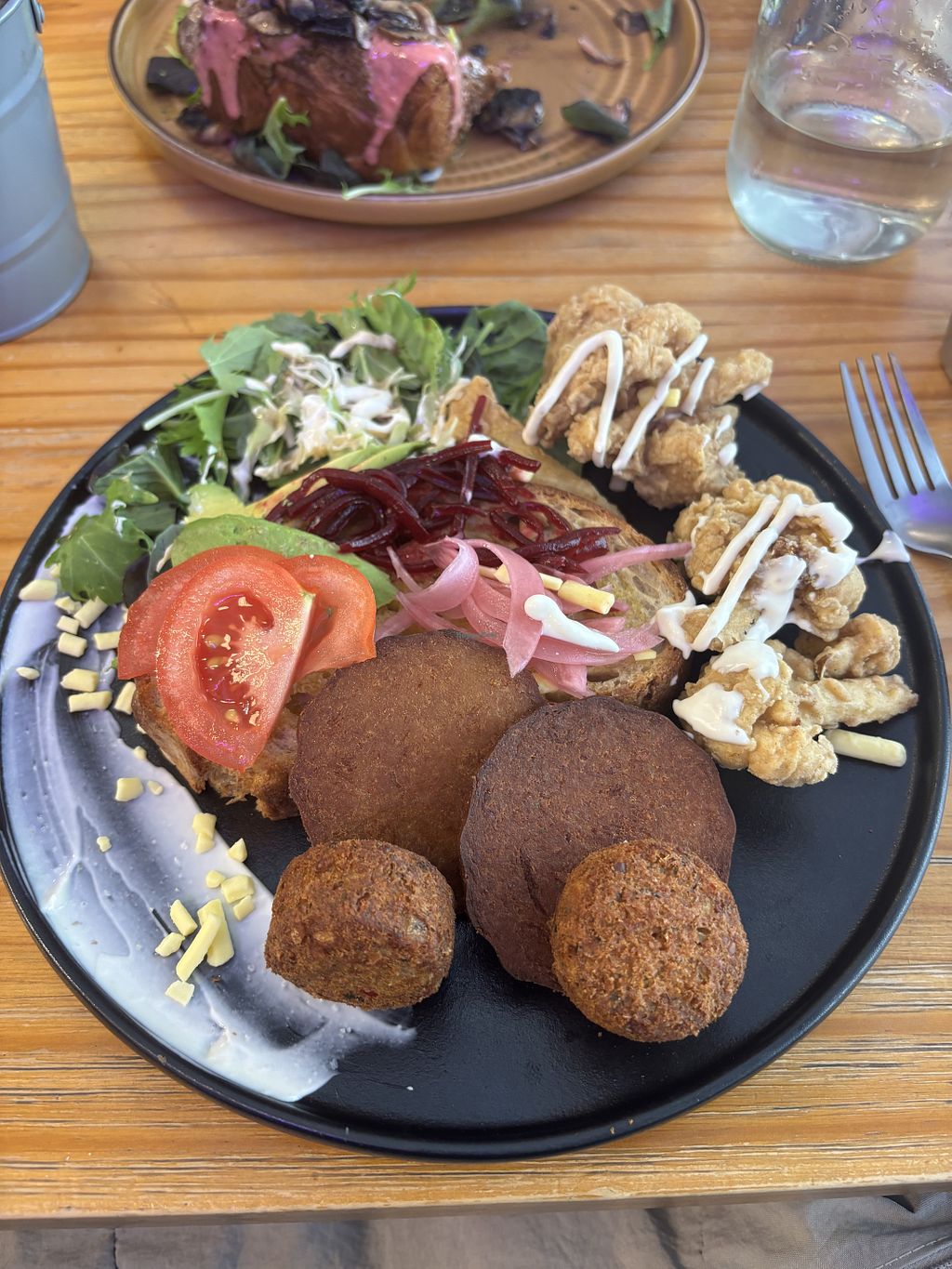 A few slivers of avocado and tomato wedges on the toast next to fried cauliflower, 2 slices of vegan meat and 2 falafels. All very dry with the drizzle of mayo being the only sauce.