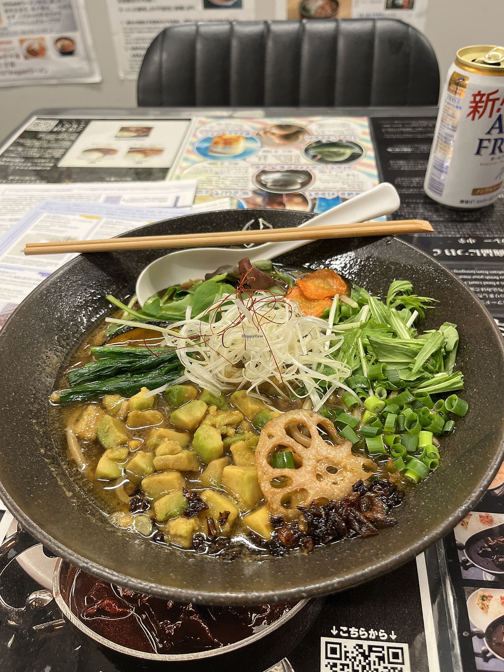 Probé el soi ramen que llevaba leche de soja, estaba muy muy bueno. El sitio está dentro de un espacio que se comparte con otros puestos de comida. Hay que subir unas escaleras y a mano derecha está este sitio. Hay un baño al lado. Tienen diferentes variedades de ramen vegano a precio muy económicos (a partir de 1000Y). El dueño es muy amable.