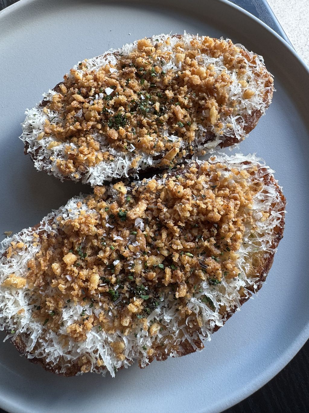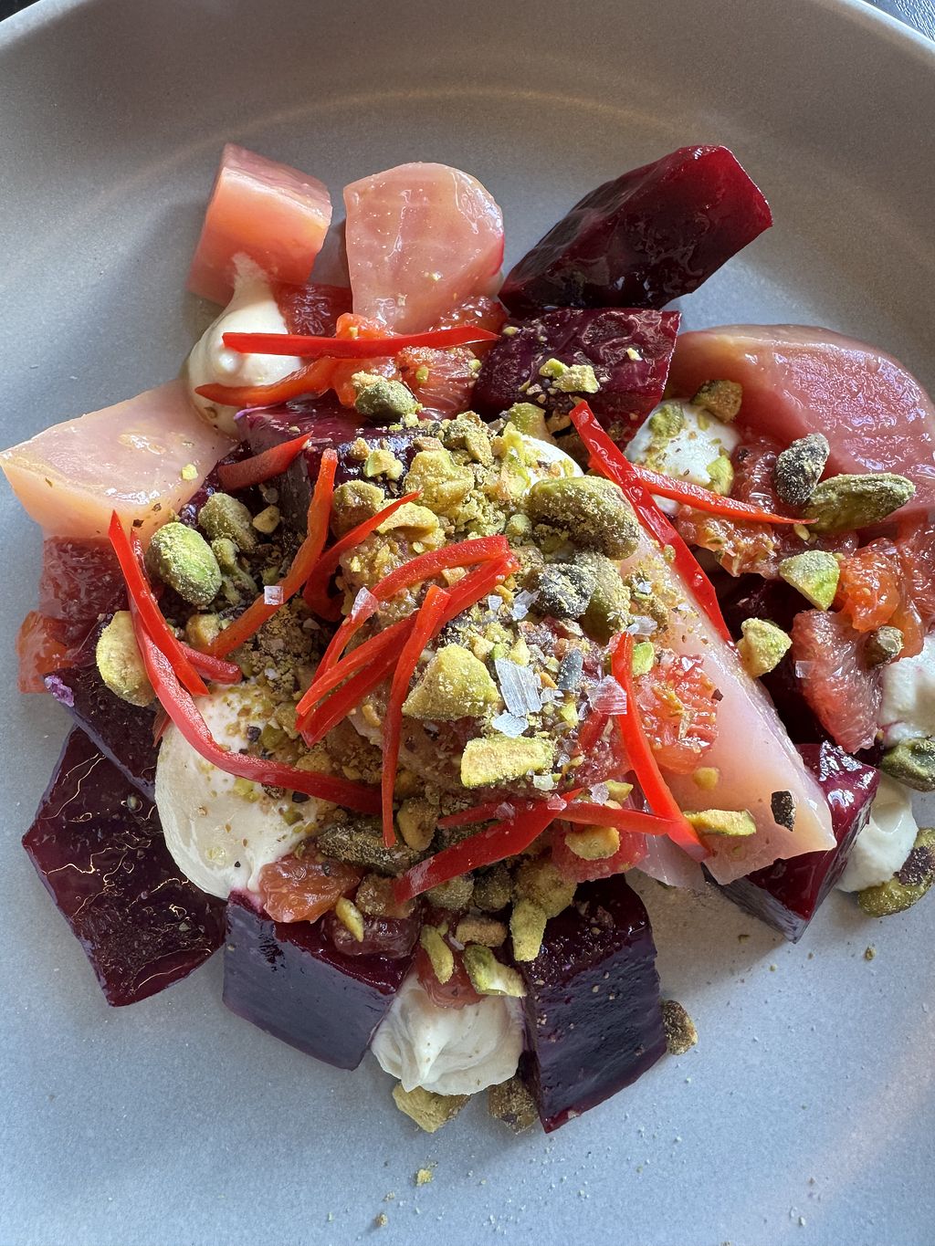 The menu online looked good so we decided to come out here without knowing the area at all. We didn’t realize it was in a food court and were a little worried we had made a mistake. But we ordered the summer spinach salad, tofu piccata and nduja toast, and it was all so good. The toast was one of the more creative veggie toasts I’ve had—lupini beans, fennel and romesco, so yum. I highly recommend. Think we might want to try the Reuben next time.