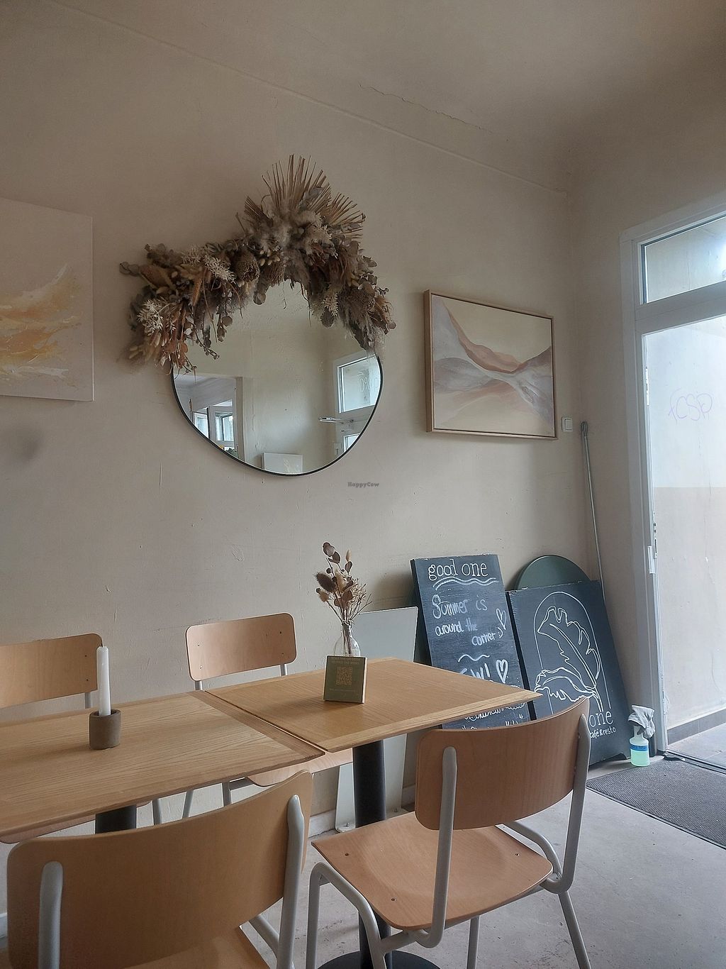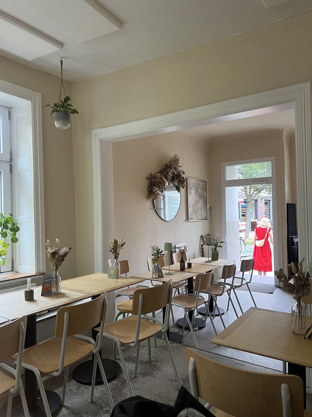 super cute café, they offer so many things that sound interesting and delicious so it was difficult to decide what to go for and it hurt my heart that I was too full to try any of their cakes, which were also so many and looked great! I had the breakfast burrito, it was very delicious though I was surprised its cold and also it's very easy to make a mess of yourself while eating this 🥲 I've had better scrambled tofu but the mix of it all made it very tasty. Also took a cinnamonroll to go which was very delicious too. The staff was a bit too nonchalant for me but I still had a good time and I want to come back to try more things!