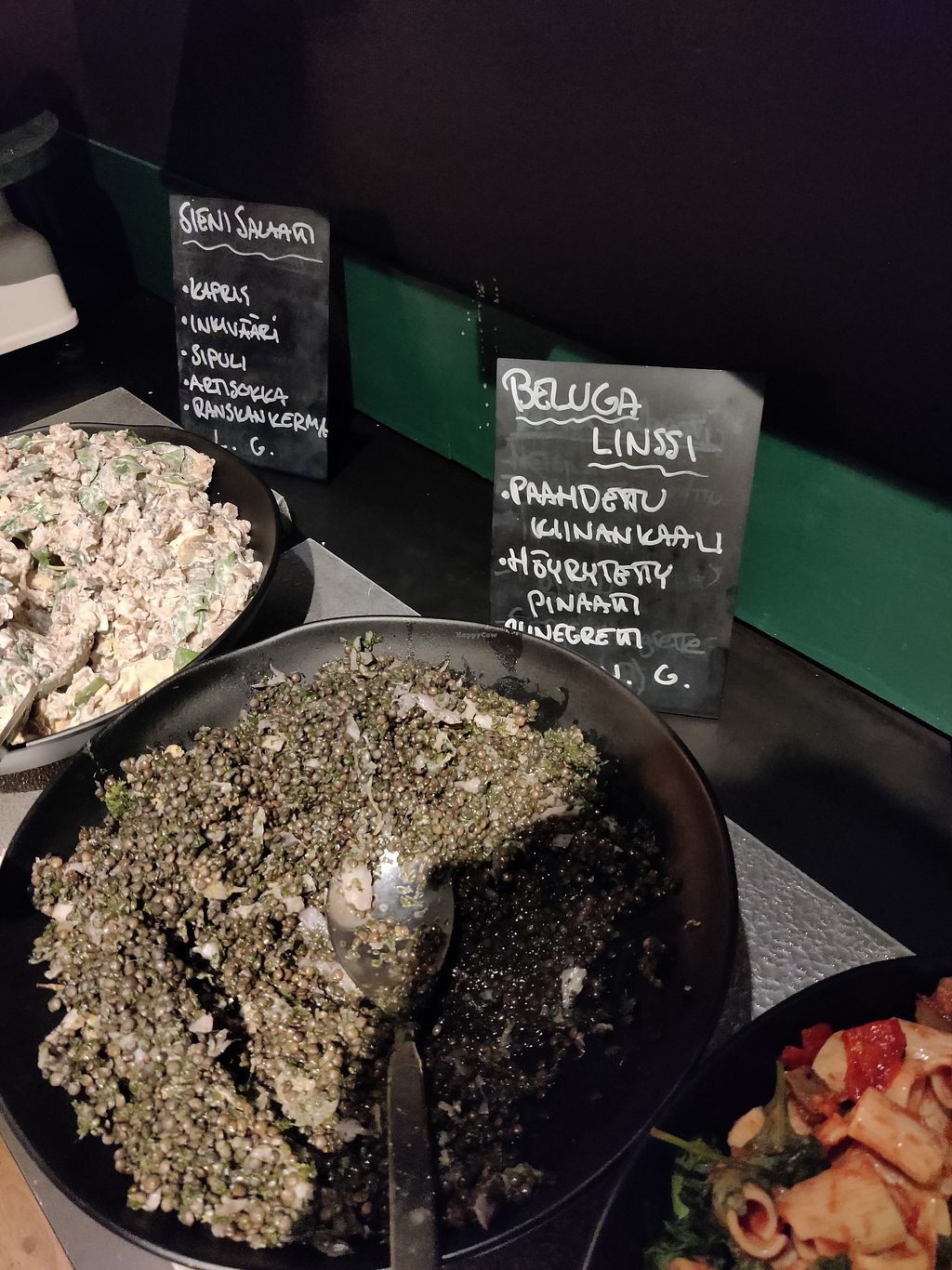 Serves meat, vegan options available. Bistro serving French-inspired dishes with Finnish ingredients. Vegan options are marked. Choices include various antipasti, crispy tofu, and oven-roasted celery with shitake mushrooms. Open Mon-Thu 12:00-23:00, Fri-Sat 12:00-00:00, Sun 15:00-23:00.