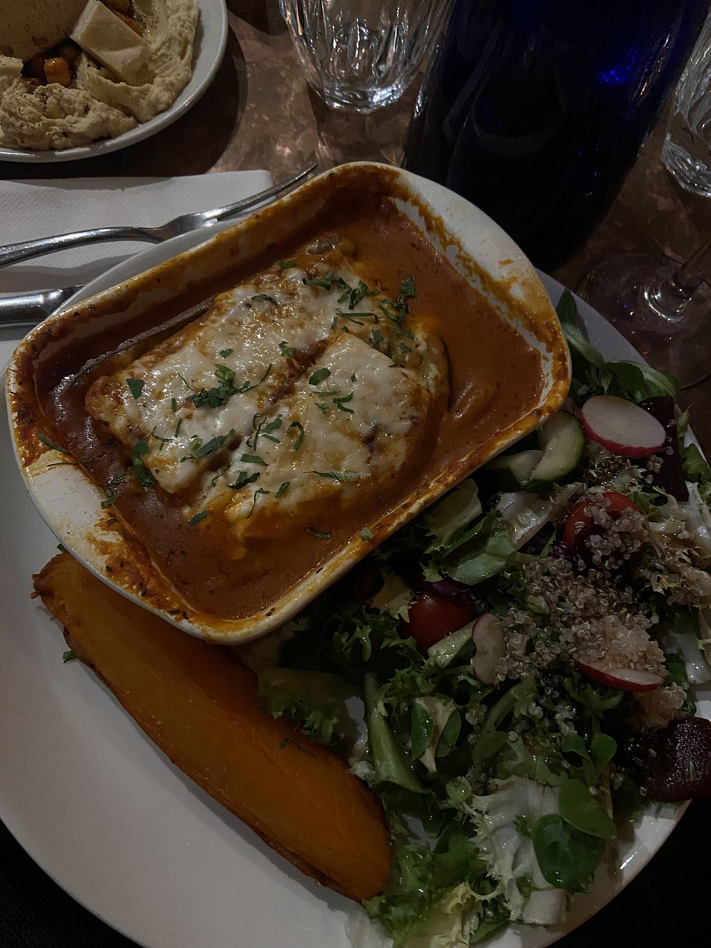 Great vibes, classy. Enough vegan options, lots of salads / hummus / breads. Just the one vegan ‘main’ the moussaka.