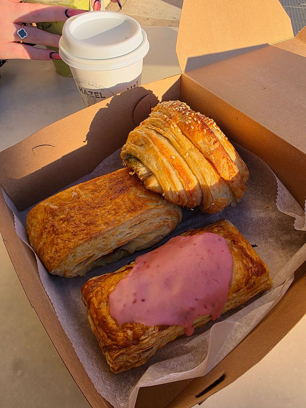 I have had Hazel & Jade on multiple occasions, and the pastries are generally really good. My personal favorites have been the mini loaf cakes and breakfast croissants. Even my mom, who rarely eats vegan cheese, really enjoyed their breakfast croissant. The last time I went, I ordered a chai, and it was mediocre and very sweet, so I wouldn’t order drinks again.