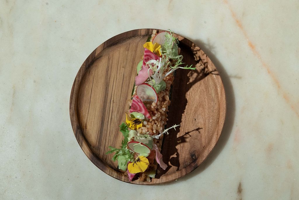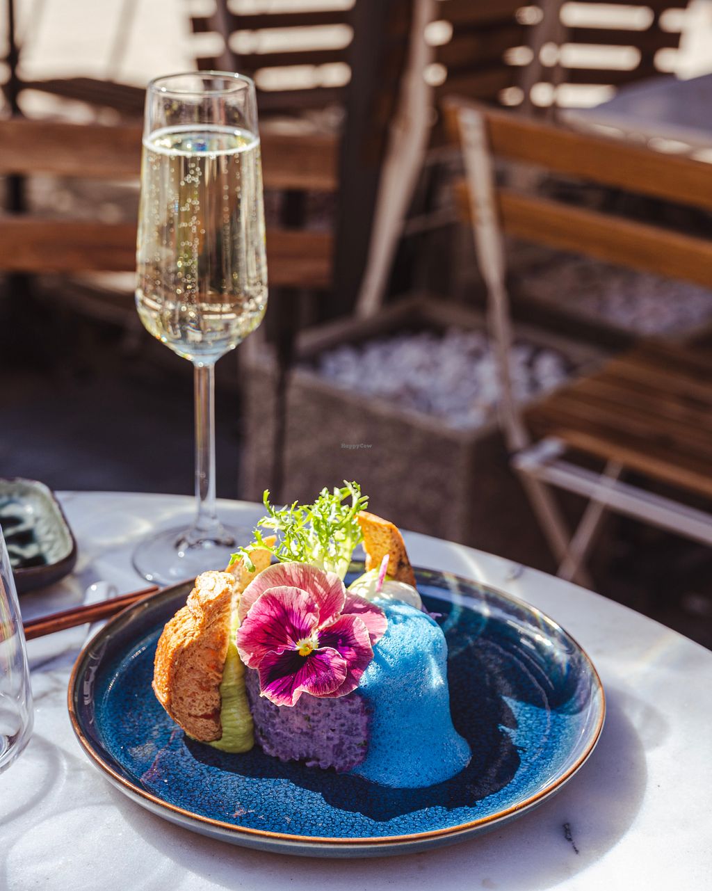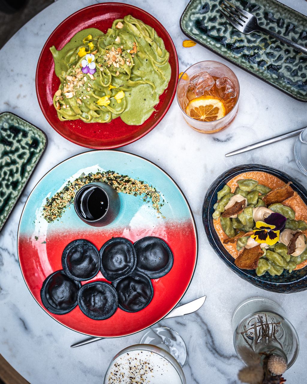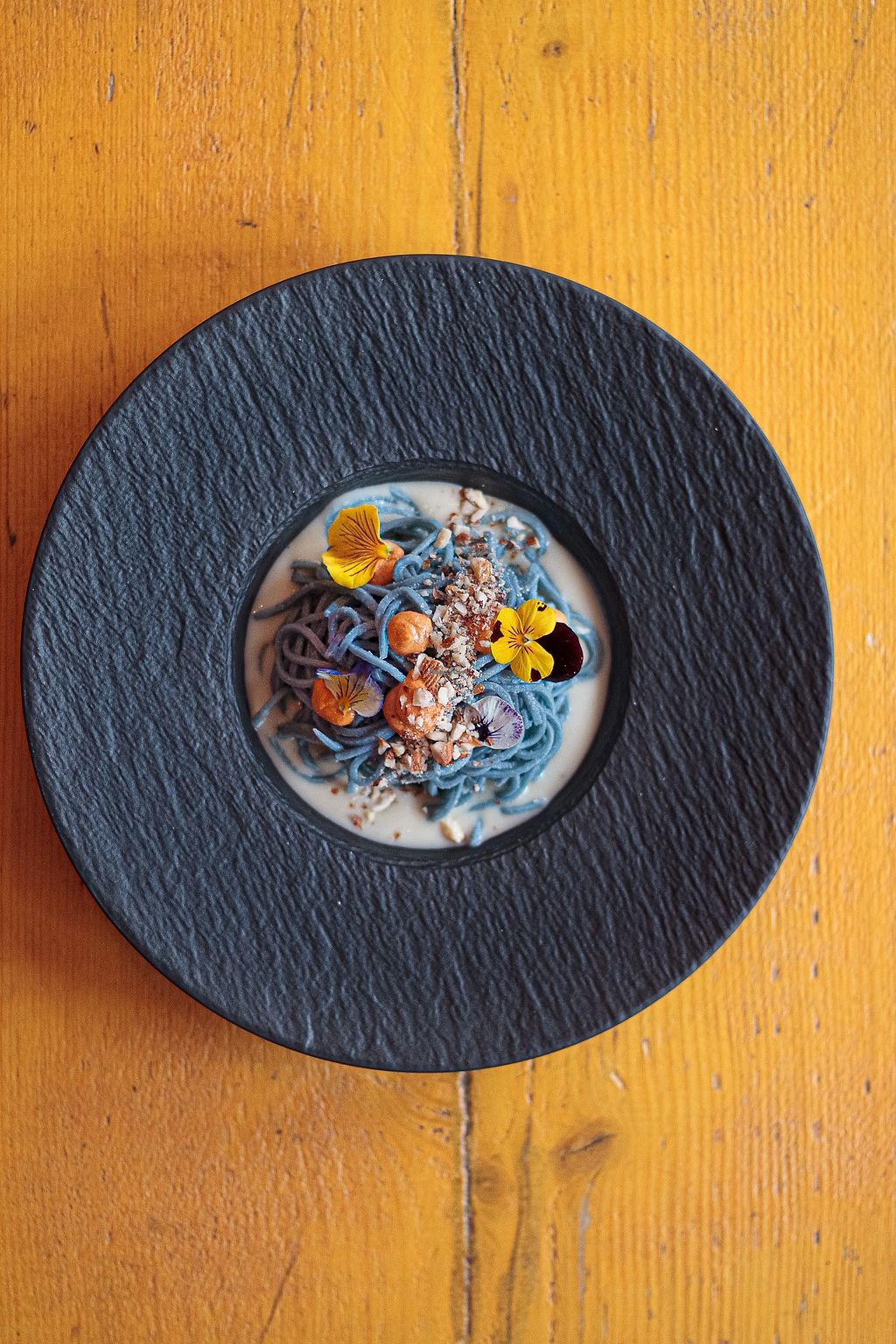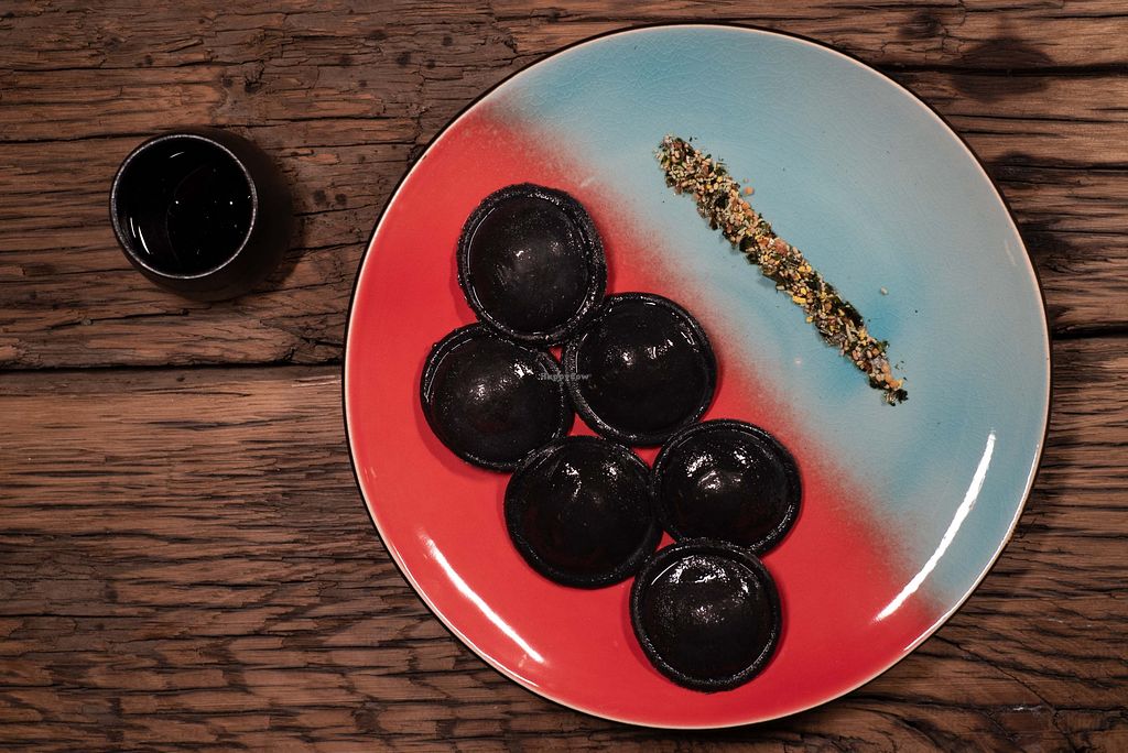 Zwarte charcoal ravioli gevuld met shiitake, teriyaki saus, wasabi cri…