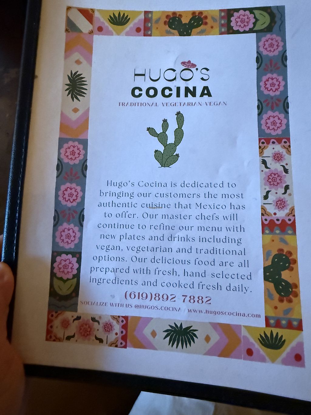 Hugo’s was delicious. We ordered the nachos, “fish” tacos, and potato fajitas. Everything was delicious and the servings were large. Leftovers for days!