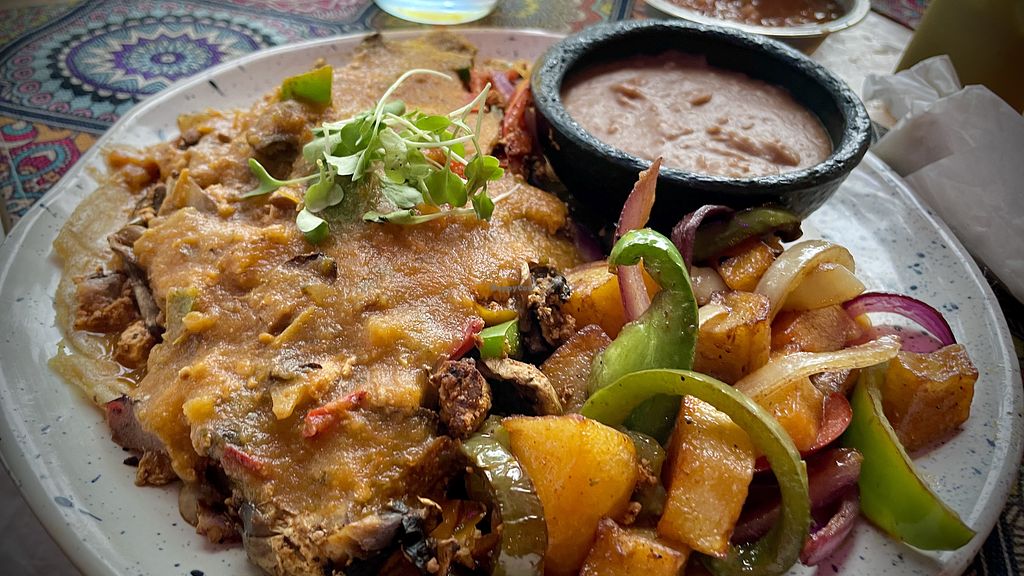 I the food is delicious! Very authentic Mexican cuisine in the vegan version. I had sweet potato burrito (it came with the whole west fresh tortilla), tofu enchilada ( it had a tomato sauce made with the fresh tomatoes) and veggie tamale (so good!). Cons - they serve animal products as well and their to go containers are plastic.