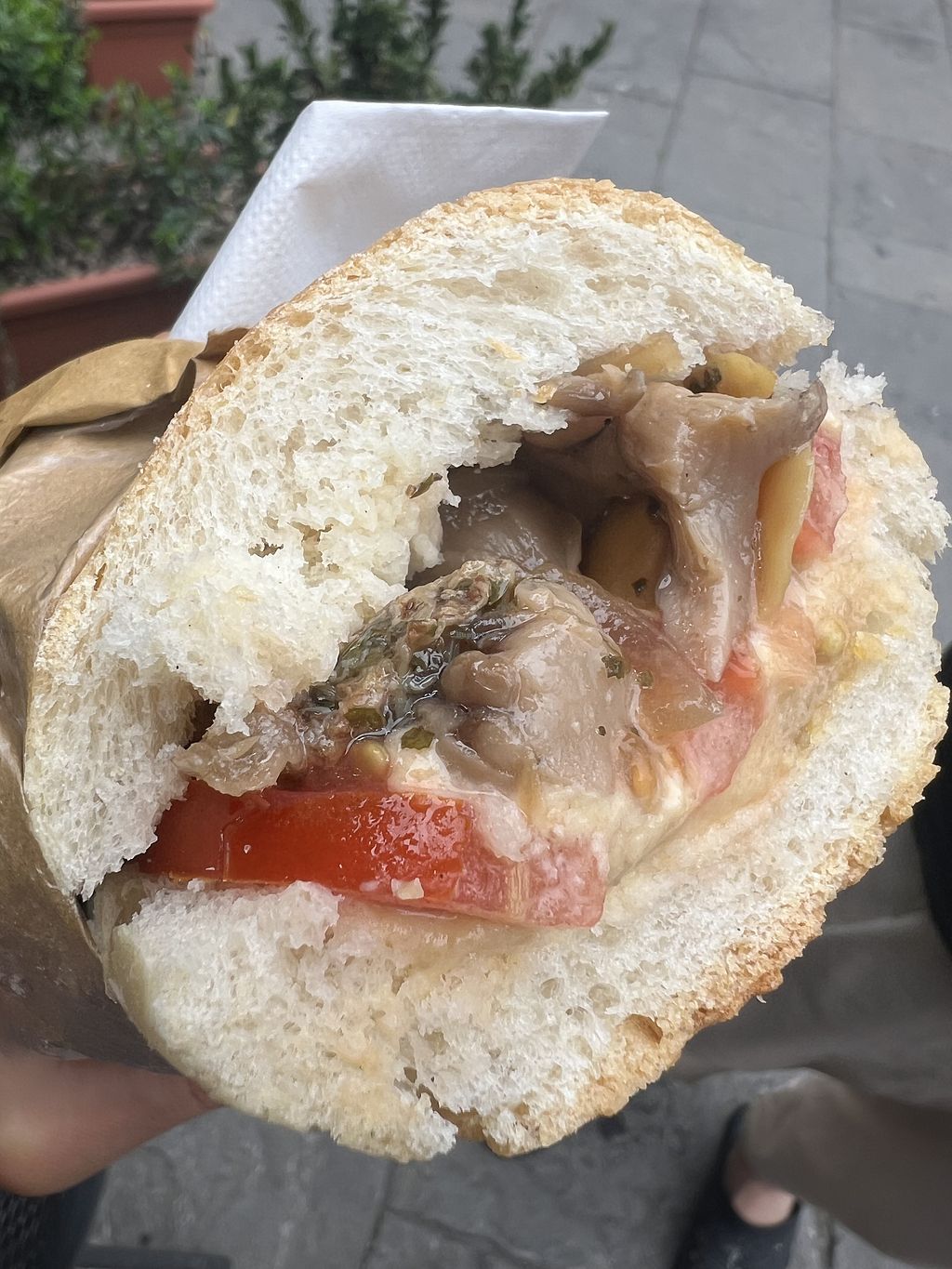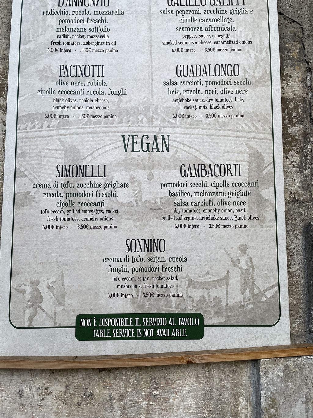 Read moreFirst of all, many ingredients in the vegan sandwiches were missing, and I wasn't able to order what I wanted in the first place. Second, the sandwich bread was quite hard and stale. And last but not least, it was not very pleasant being met with rows of prosciuttos (aka legs of dead pigs) hanging from the ceiling right after entering the shop. I get that most restaurants serving meat don't magically grow it on trees, but still, the overt display made me feel more uncomfortable. Long story short, although it looks like a very vegan friendly place at first glance, it was not for me, and I don't think I'll be visiting again.