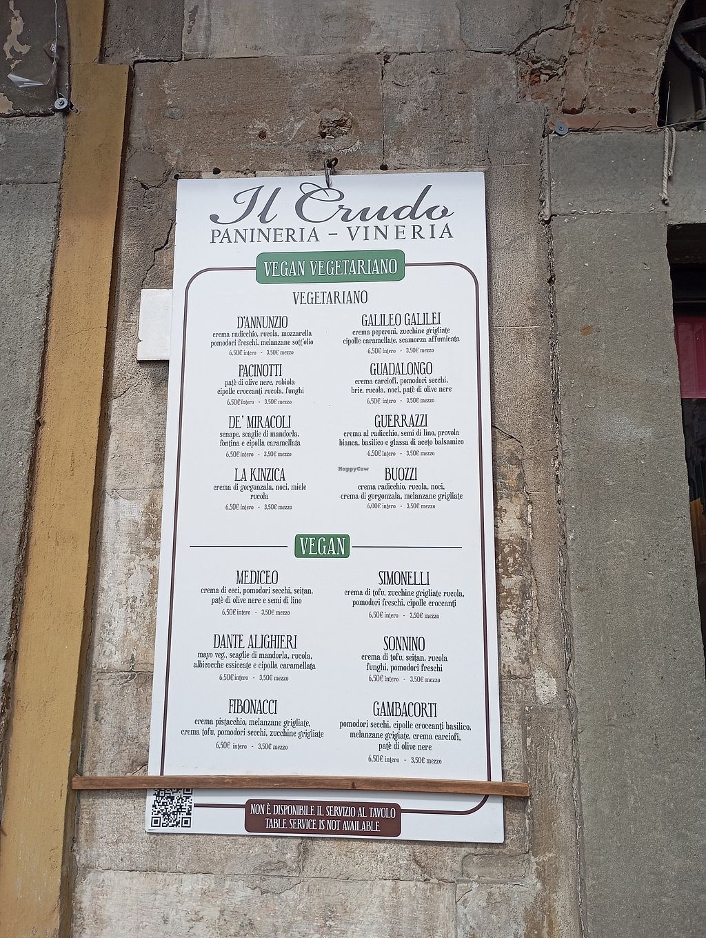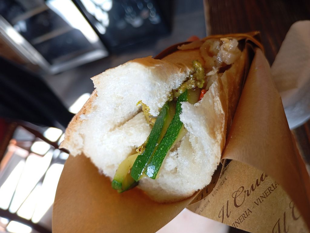Il crudo offre 6 tipologie di panini vegani. Il pane è buono e gli ingredienti anche. Il panino intero è mezza baguette ma si può chiedere anche il mezzo panino. C'è posto a sedere fuori e pochissimo posto dentro, ma no servizio al tavolo.