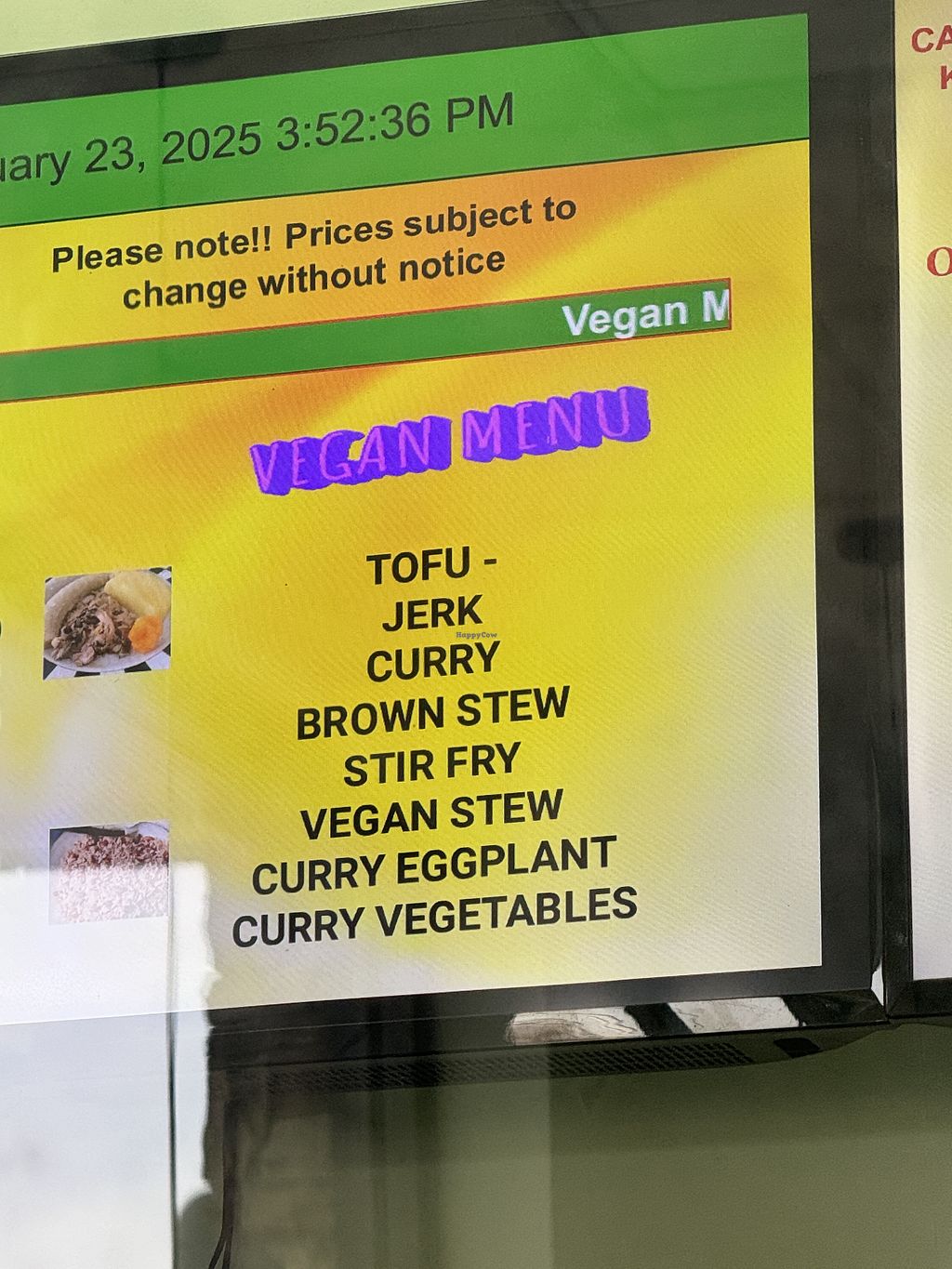 Serves meat, vegan options available. Caribbean restaurant offering a vegan menu that includes tofu, rice, peas, curry, vegetables, curry eggplant, stew, stir-fry, and more. Open Mon-Sat 11:00am-8:00pm. Closed Sun.