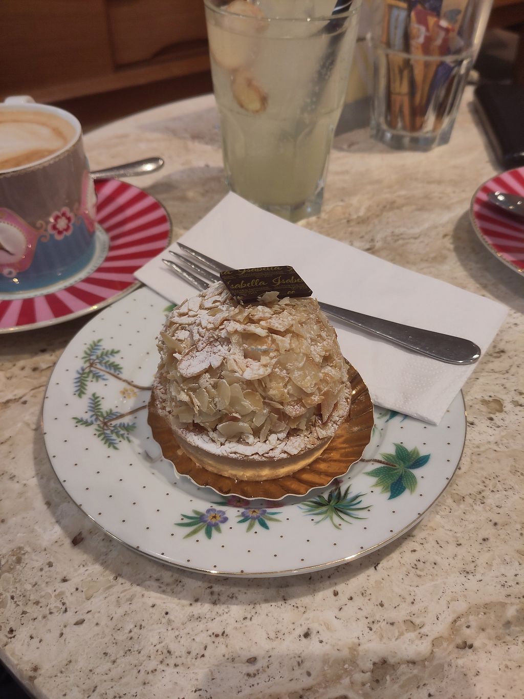 The only thing really worthy were the macarons, they were simply to die for!!! Staff a little bit impatient/arrogant, inside is pretty fancy and too complicated to get a table to eat there and sit a little bit and relax/enjoy the vibe (you have to reach another balcony inside the patisserie and give your name and wait). So, I took everything I ordered as take away. The cake was too expensive and too dry with lots of crumble for what you get (I know that is gluten free and everything that is gluten free has much more crumble, but this cake isn't worth trying, paid 8,20€ for the slice waiting for something heavenly). The macarons were simply perfect, so go there to try them! Bought one of each. They sell also some biscuits and choc bars, they are also good - but also too expensive! 3 stars just for the macarons!