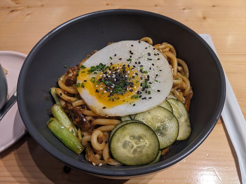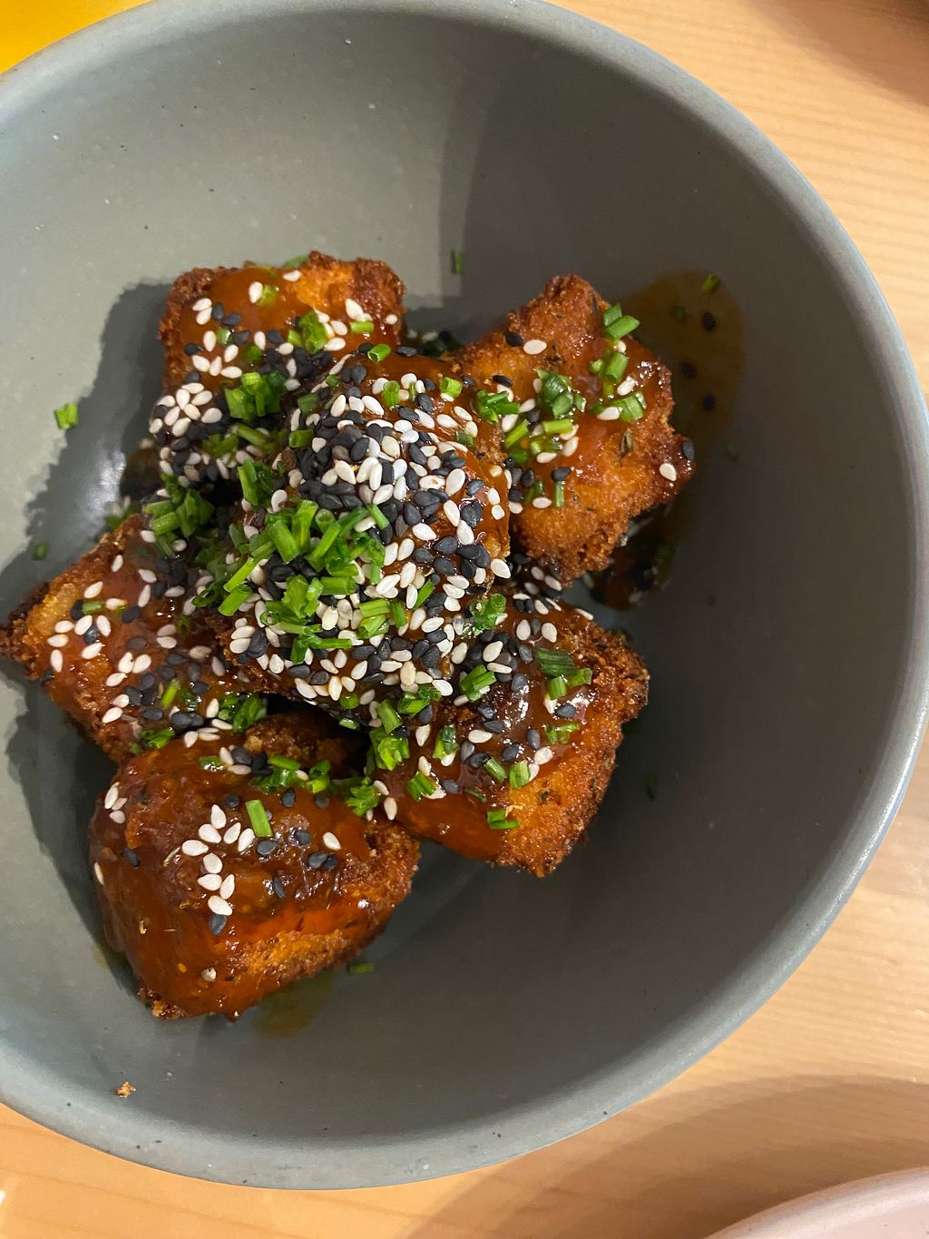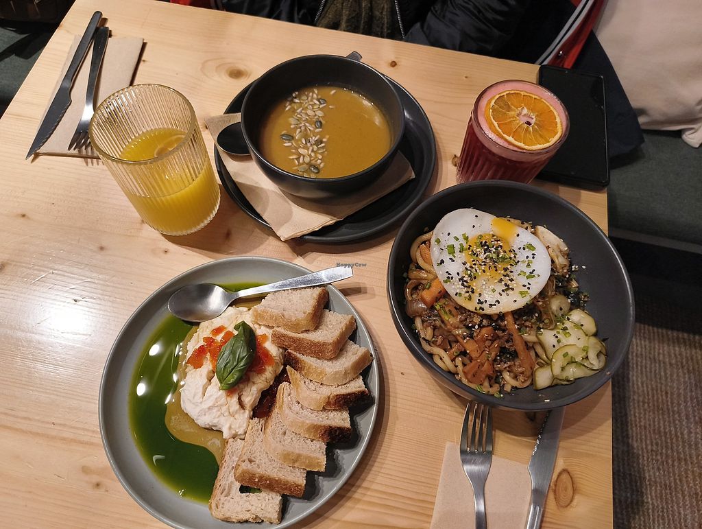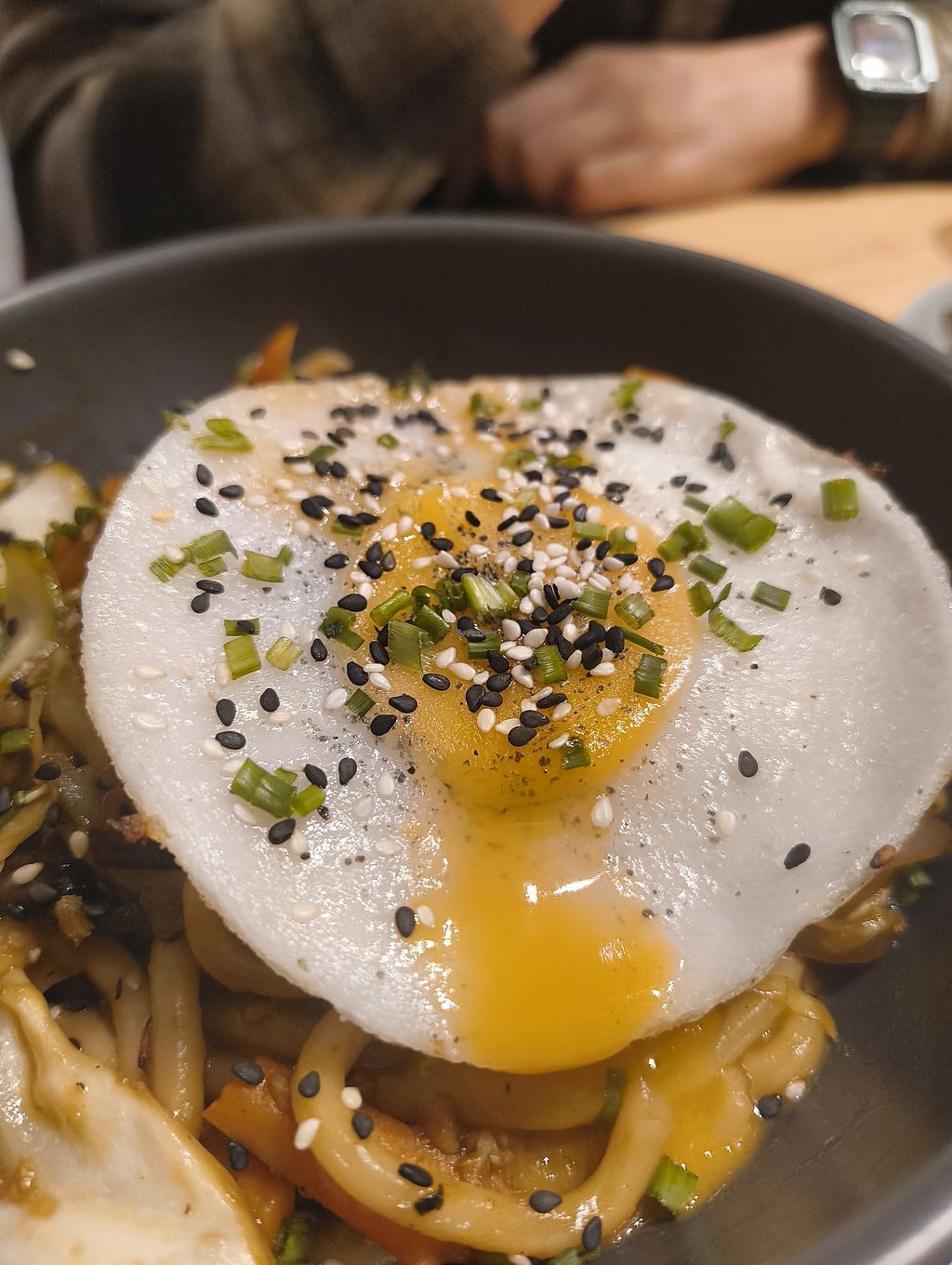 We had the crispy tofu bao and empanada for starters. "Salmon" bowl and Yaki udon for mains. All the food was delicious, the starters were especially yummy! We were amazed at how much the "egg yolk" on the Yaki udon looked and smelled like an egg yolk. Good portion size, good service and a nice cozy atmosphere too.