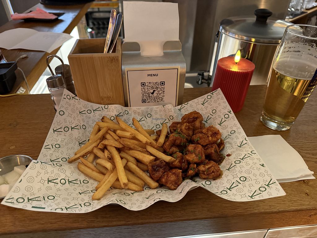 Serves meat, vegan options available. Restaurant specializing in Korean-style fried chicken. Menu includes vegan chicken-style fried tofu with chips, vegetable dumplings and various sauces. Open Mon-Sun 16:00-23:00.
