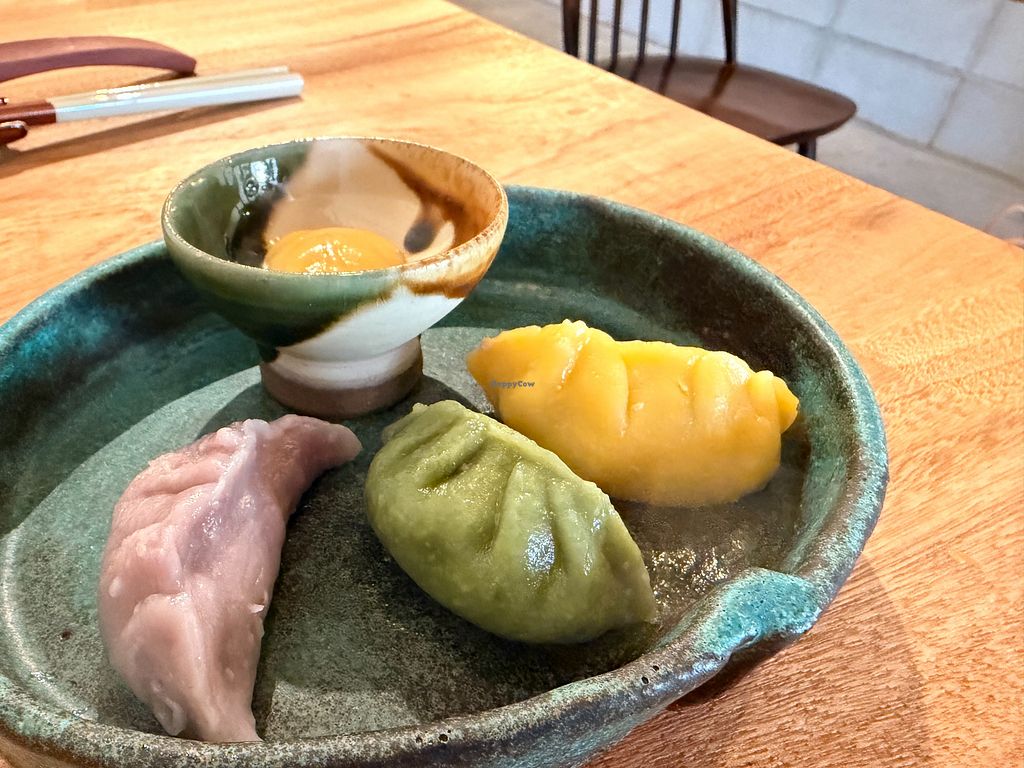 Toppings feature beautifully prepared Kyoto vegetables, each cooked with care, adding color and seasonal character to the bowl. Handmade vegan gyoza and small vegetable side dishes are also available and pair perfectly with the ramen.