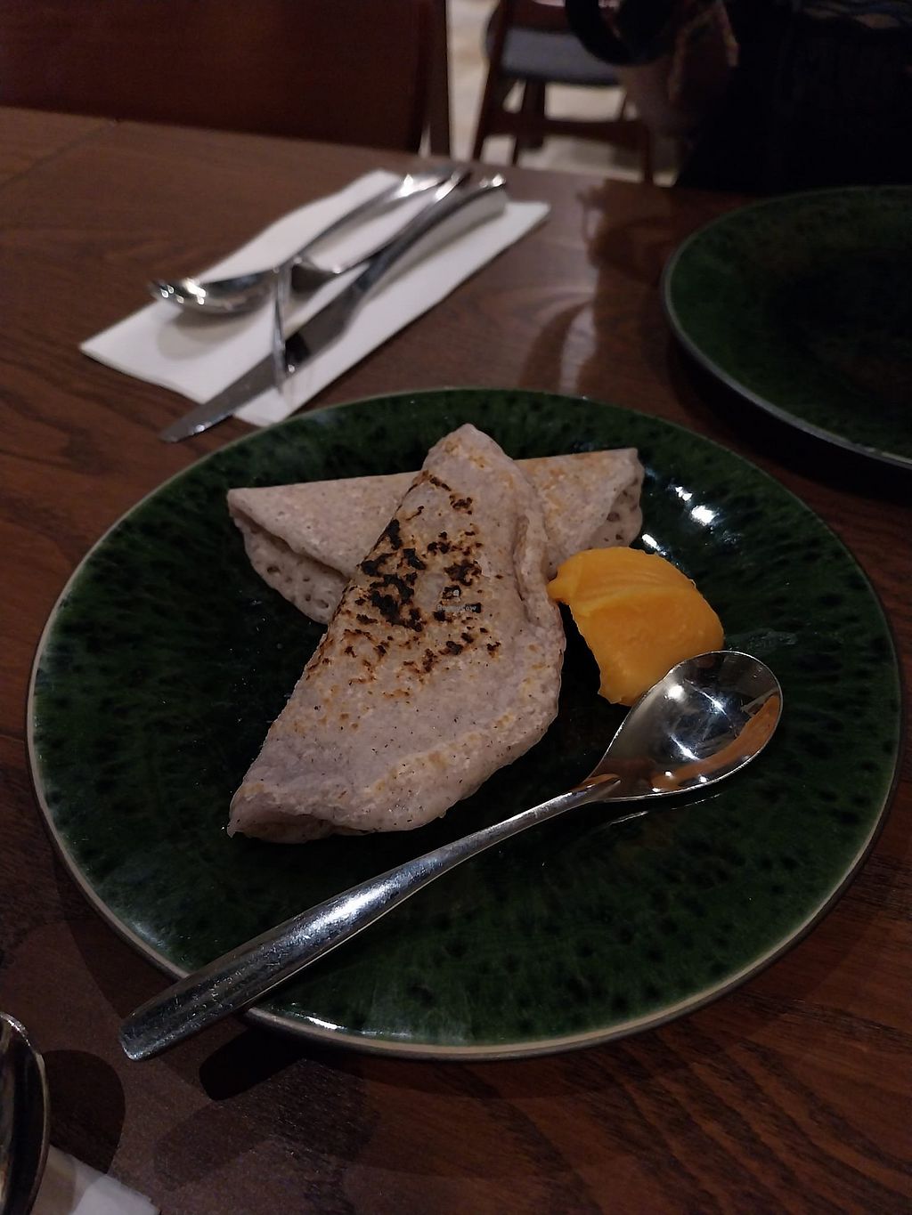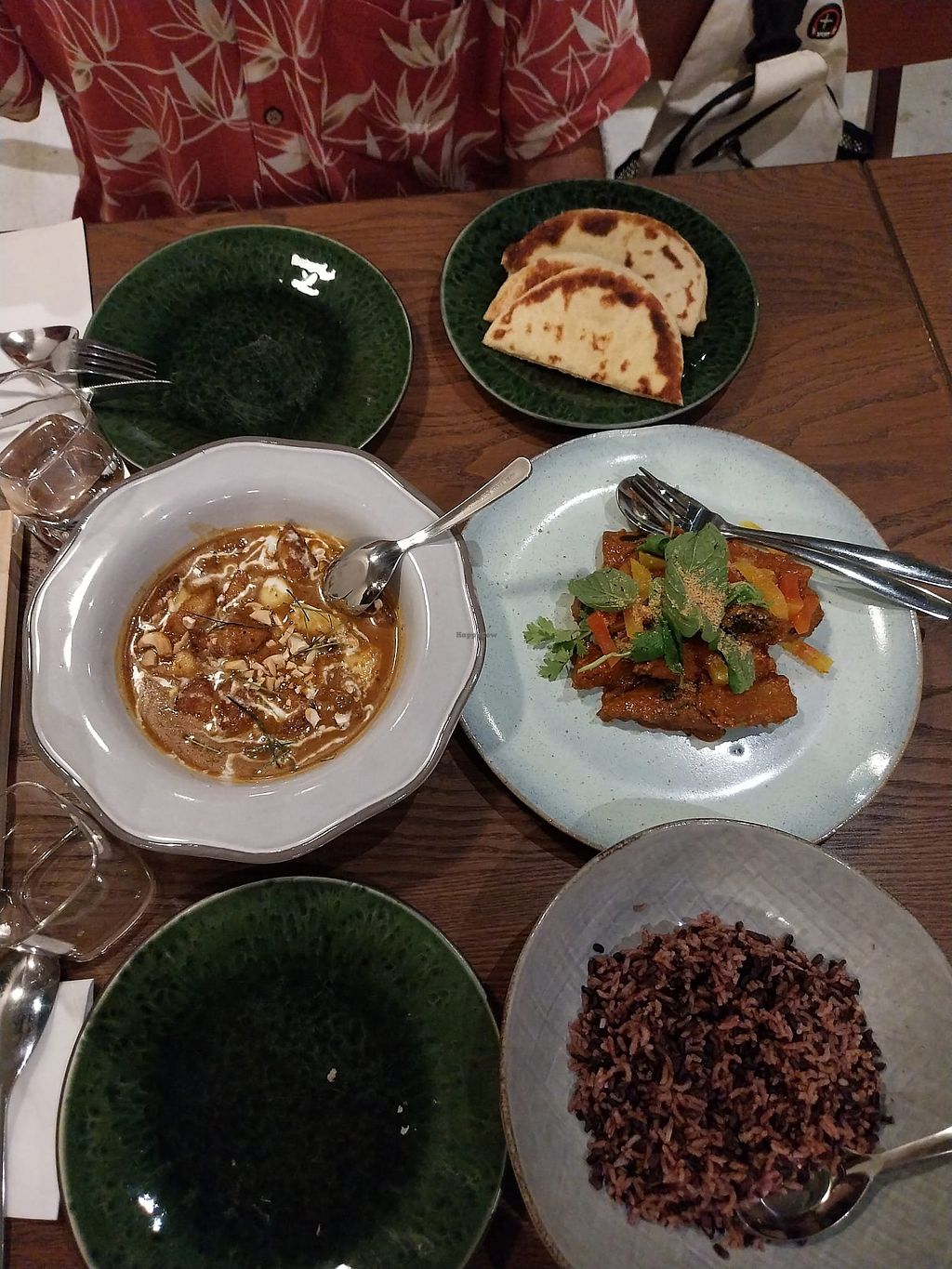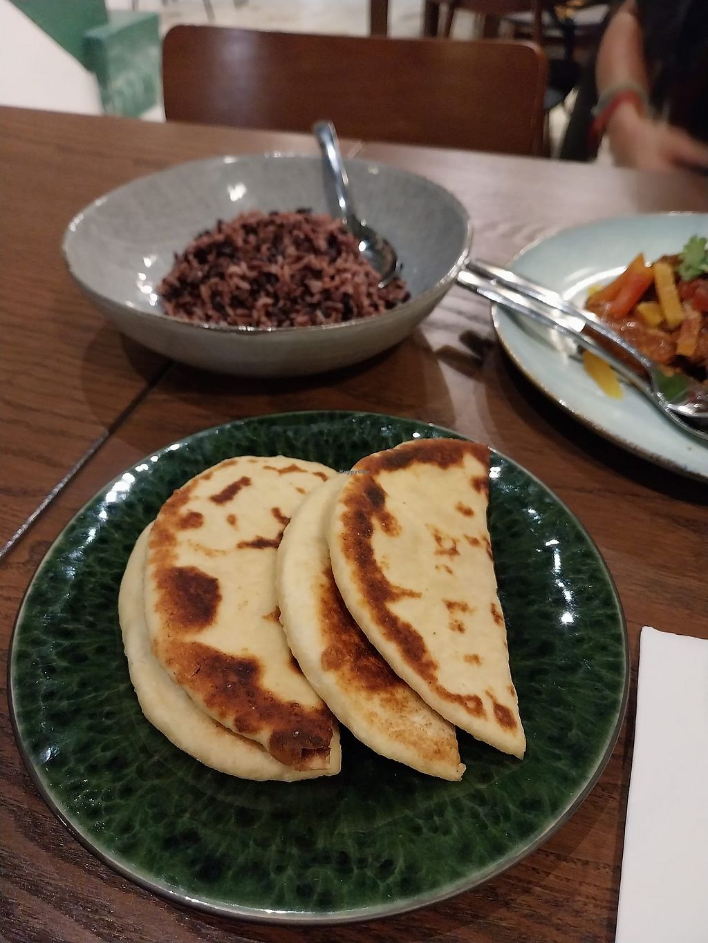 My partner and I both ordered the rendang with a flatbread and we enjoyed the dish. The courgette pieces were well cooked and the sauce was nicely seasoned but it didn't really wow us. There were some herbs and bits of pickled papaya on the plate which added some different textures and flavours. The meal was tasty without being truly great and I feel it would have benefitted from some more sauce. The bread was generally quite well made, it was maybe a bit thick and my partner thought it tasted just a little bit sweet.