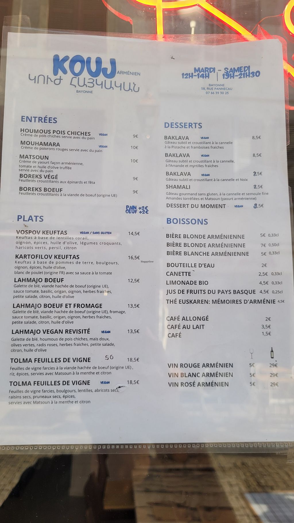 Attention !!! Menu mensonger pour le.a consommateur.rice. Plusieurs options sont marquées comme "vegan" dans le menu et ne le sont pas. Produit laitier d'origine animale dans la sauce servie dans le "Tolma feuille de vigne" par exemple.