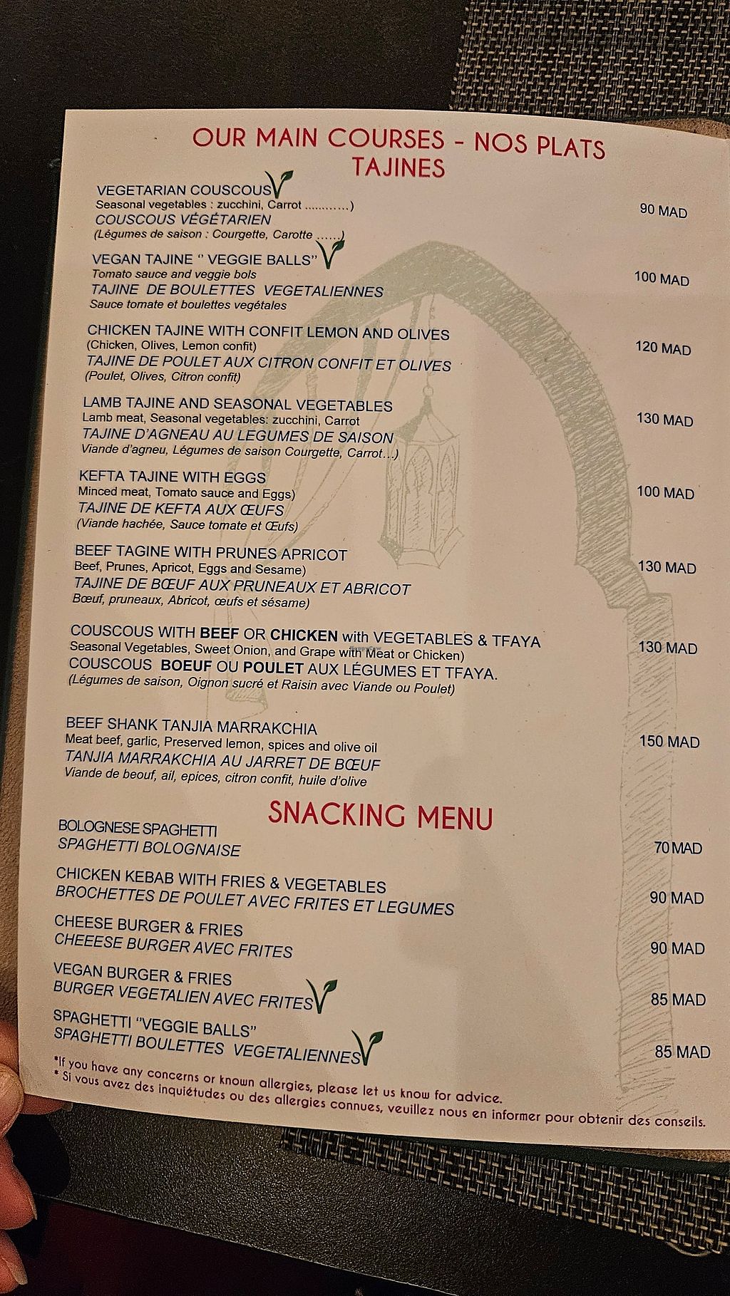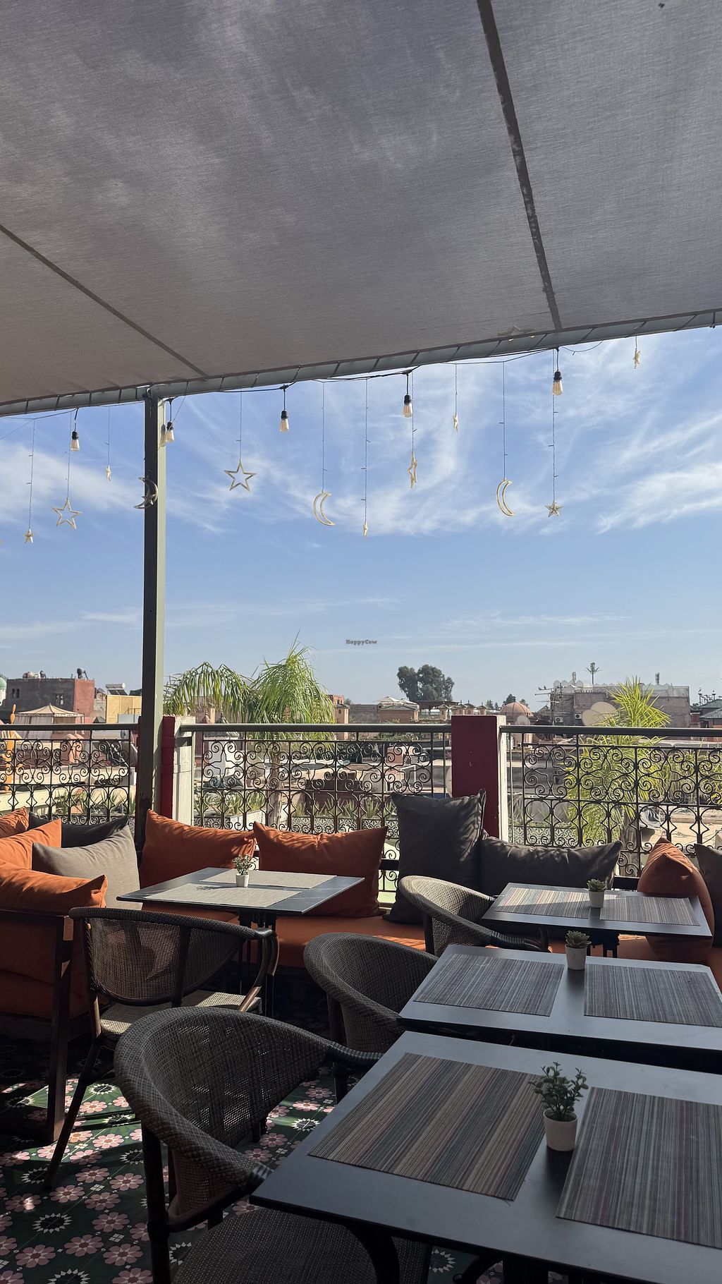 Great spot to spontaneously have dinner, since no reservation is required. The view from the top terrace is amazing! You can see the Atlas mountains beautifully. Vegan options are clearly named, although one had honey listed. I first wanted the vegan spaghetti, but it was not available, so I settled for the burger. It was good except for the dip. The cigars were okay. My husband was also very happy with his vegetarian couscous. He could not notice anything clearly non-vegan about it, so maybe it was vegan as well.