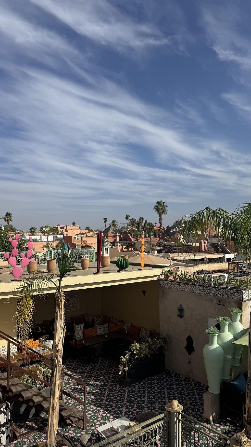 We couldn't go to the rooftop as they said it was for reservations only. The lower roof was very pretty still and the music was nice. The soy pastille was tasty but I think it has honey in and the meatball tajine was good but they were beany rather than meaty. I ordered chips with it too which were nice. The chocolate mousse was amazing