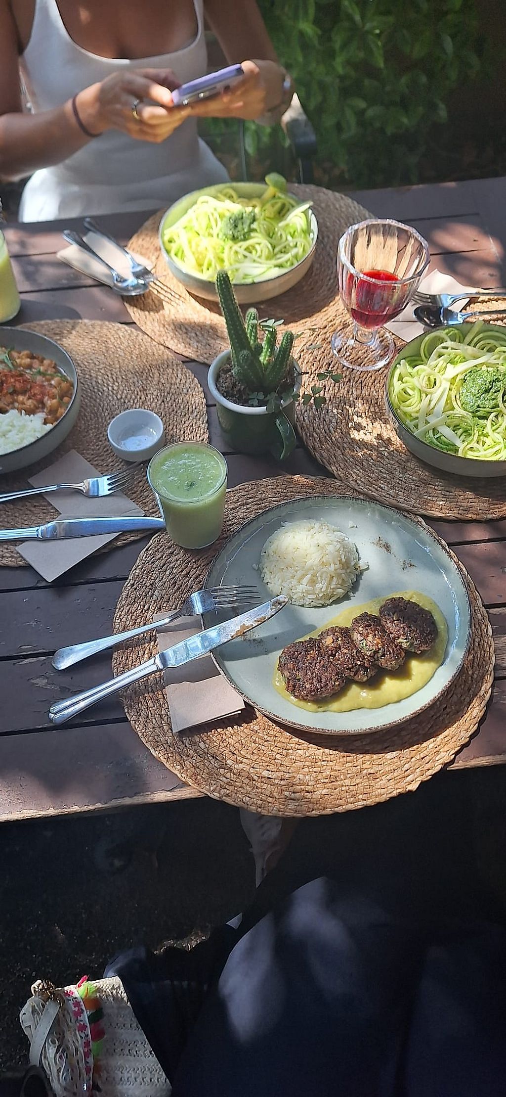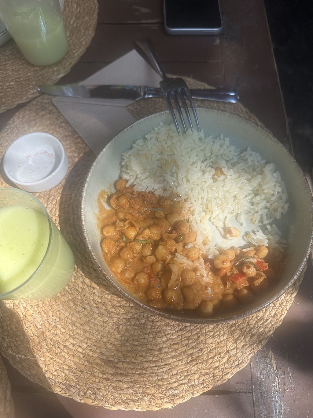 Aubergine topped with lentils, tomato and tahini. Side of salad and bu…