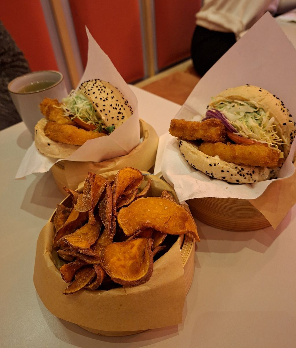 Die Burger sind echt groß, großzügig belegt, der knusprige Tofu frisch frittiert und super knusprig, das Gemüse frisch, das Brötchen sehr fluffig und die Süßkartoffelchips sehr knusprig und aromatisch