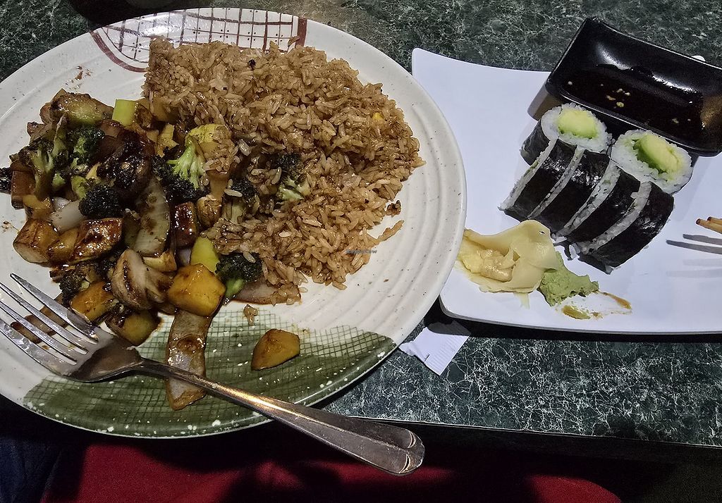 Staff was nice, food was just ok. The vegetarian hibachi is the only option as far as hibachi is concerned. I got fried rice without egg and they use margarine so there's no dairy in the butter. Then it's just vegetables in I think teriyaki sauce. It was too salty overall and I mixed in steamed rice. Also I asked for miso soup because the clear soup is chicken broth. I also got avocado sushi, which was good; it was fresh which is probably the best thing you can say about a simple sushi roll and Iliked it better than the hibachi itself. It's a shame they don't offer tofu or some protein. They also had a few other sushi options like sweet potato, and there's an aged tofu appetizer.