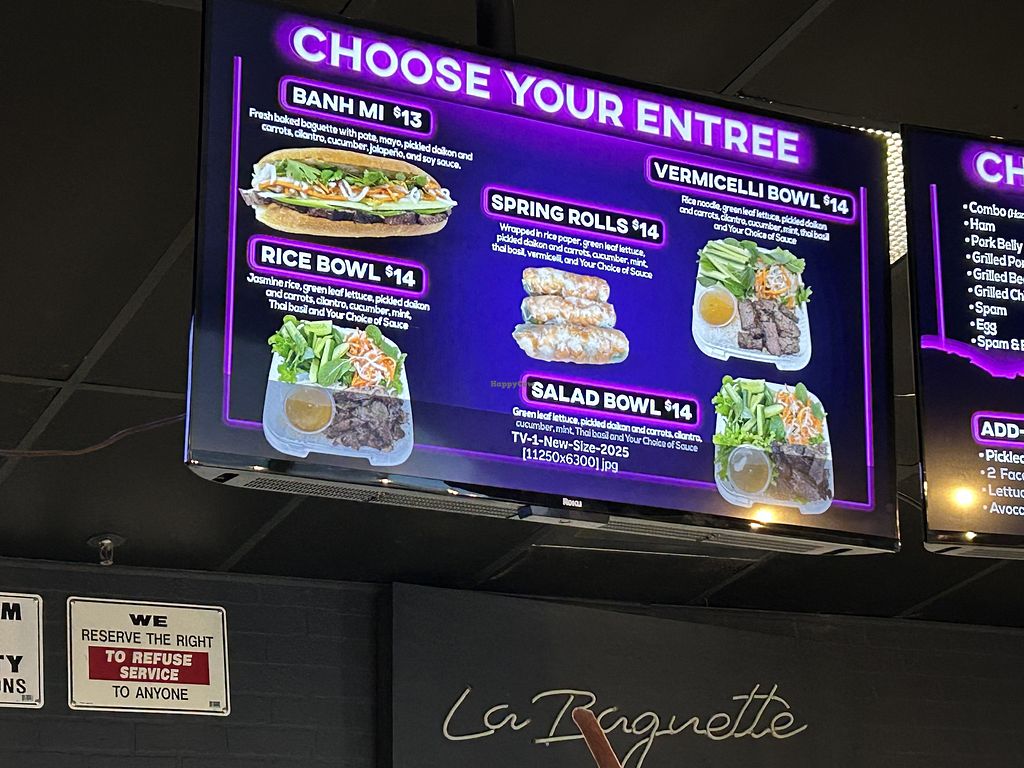 Couple of vegan options. Prices not displayed on the electronic menu. Bahn mi is $14 which seems steep but a good sized sandwich and ingredients tasted fresh.