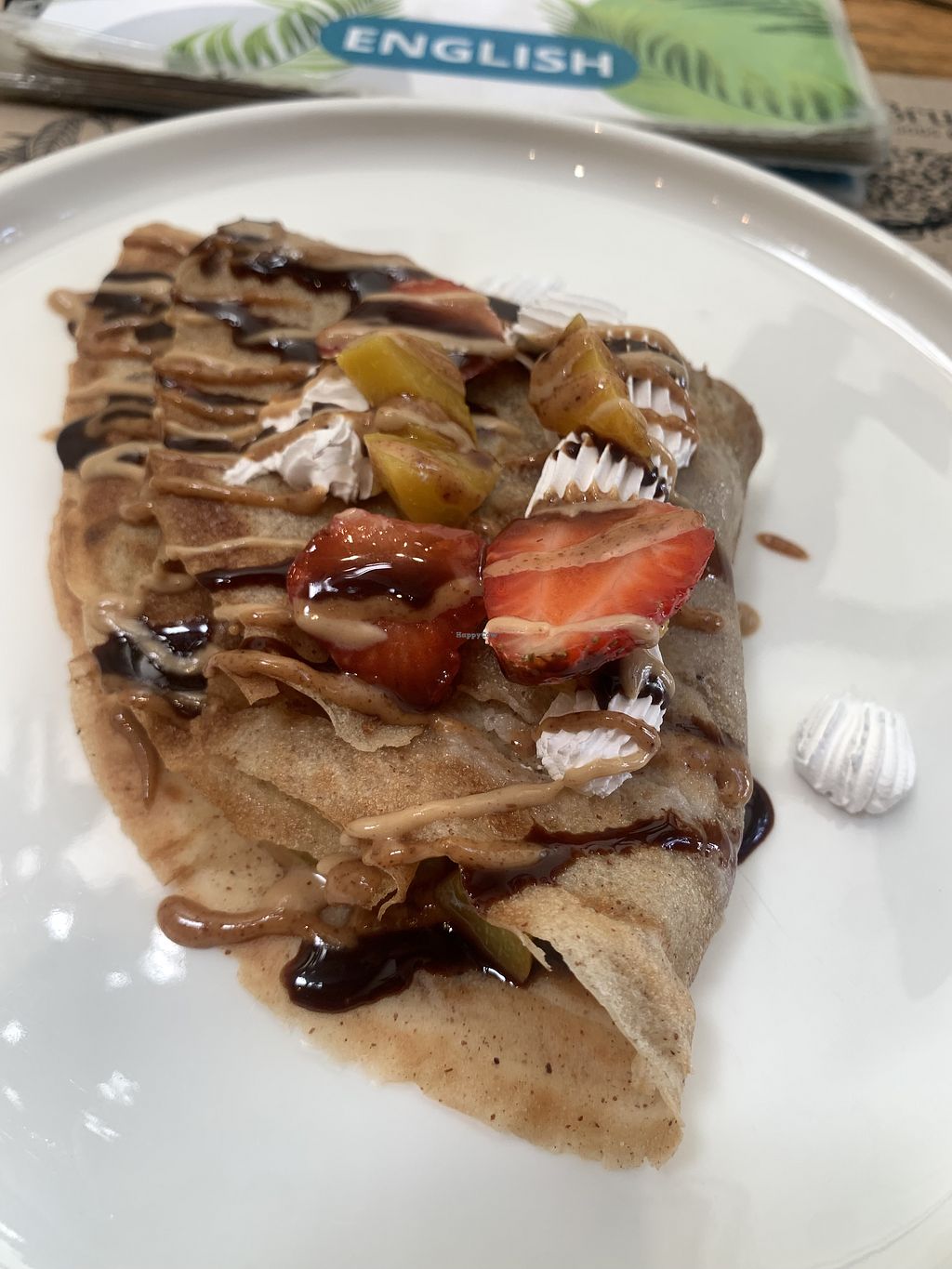 They had a lot of food to choose from but weren't actually hungry so just had tea and a tasty crepe. The service was good and the view from the well hidden roof terrace fab. Recommend.