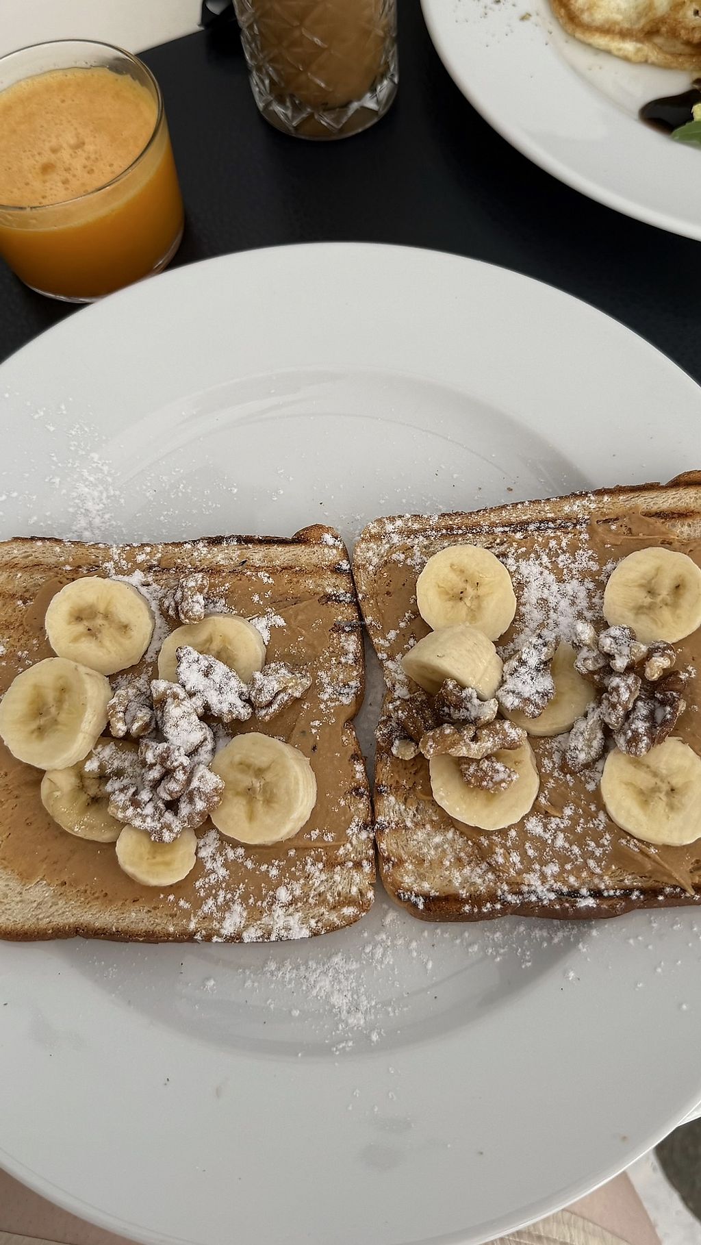 The vegan breakfast was excellent. The two toasts with peanut butter, bananas and walnuts. Also there was some granola with almond milk. Very good!