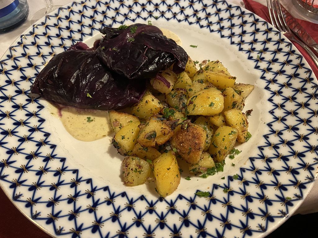 In dieser Ecke Deutschlands ist es noch sehr herausfordernd, vegane Angebote in Restaurants zu finden. Umso schöner, dass hier gleich zwei Gerichte angeboten werden. Ein mediterraner Flammkuchen und Rotkraut-Rouladen mit einer Füllung aus Maronen, Datteln, Pilzen & Nüssen mit Bratkartoffeln. Die war wirklich sehr köstlich! Leider keine veganen Vor- oder Nachspeisen, das wäre noch wunderbar. Tolle Einrichtung.