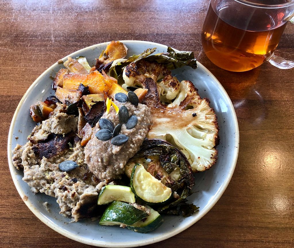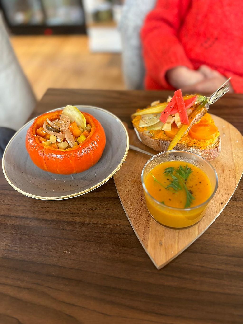 Read moreDas Essen ist komplett vegetarisch, aber es gibt auch ein veganes Hauptgericht. Bei unserem Besuch war leider der Kuchen nicht vegan. Wir aßen ein Blumenkohlsteak mit Gemüse und Auberginenpürree. Es war frisch gemacht und hat hervorragend geschmeckt.