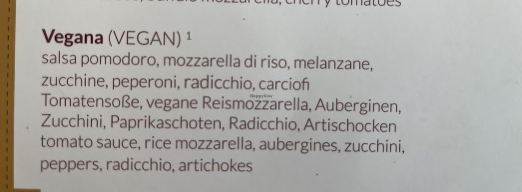 Read moreThe Pizza vegana ist very good but you can order all vegetarian Pizzas with the vegan Cheese if you ask for it.