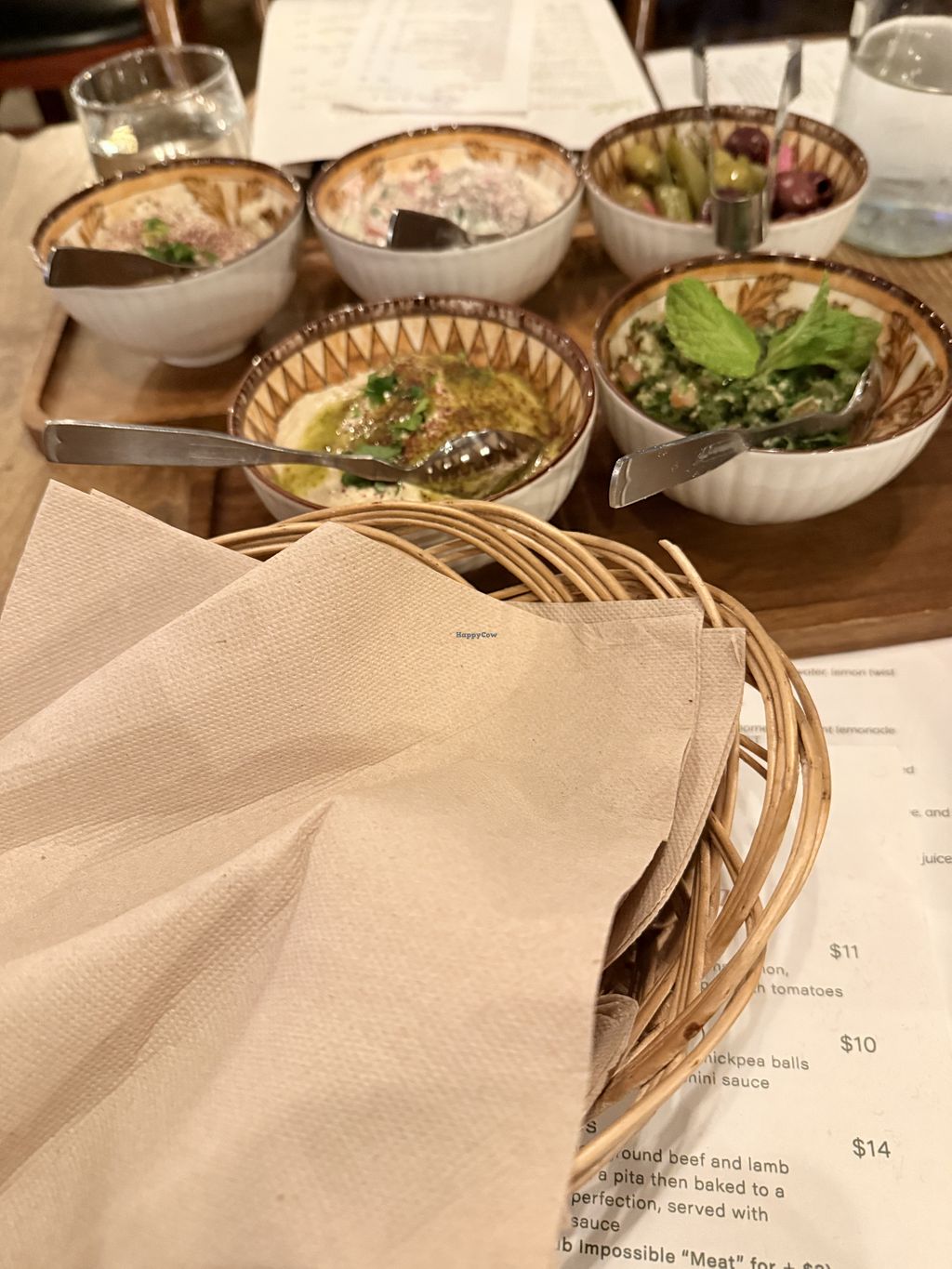 Serves meat, vegan options available. Mediterranean restaurant preparing dishes from family recipes. Vegan choices may include cold mezze, tabbouleh, hummus, baba ghanouj, muhammara and tahinyeh. Can ask for vegan choices for salata, hot mezze, levash bites, sawani. As of July 2025, has 16 vegan items clearly marked on the menu. Some gluten-free items also. Open Tue-Sun 4:00pm-9:00pm. Closed Mon.