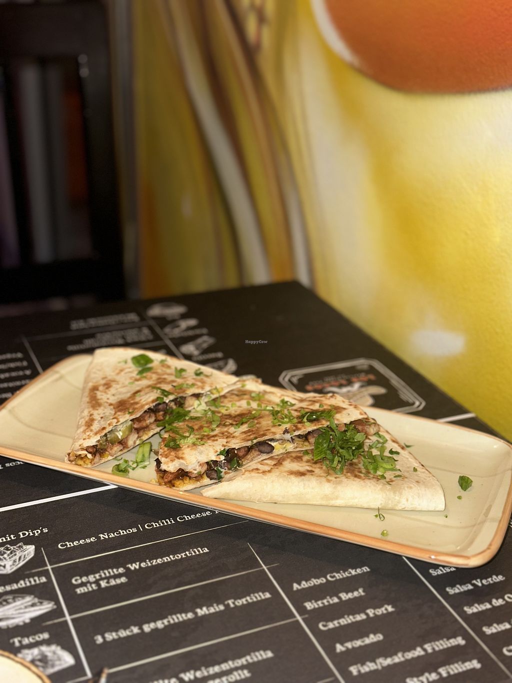 Everything can be ordered vegan - vegan cheese, vegan sour cream, vegan soy protein! They have homemade nachos. Very tasty, great coffee (can be ordered with oat milk) and super friendly staff. I also loved the unique paintings on the walls.