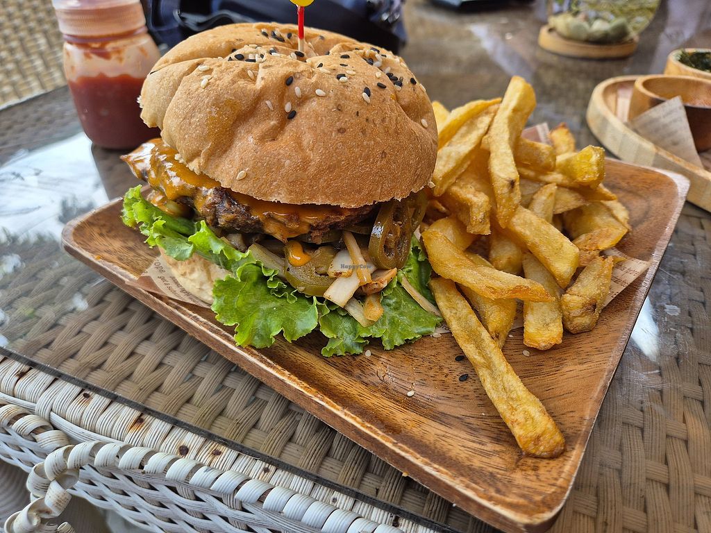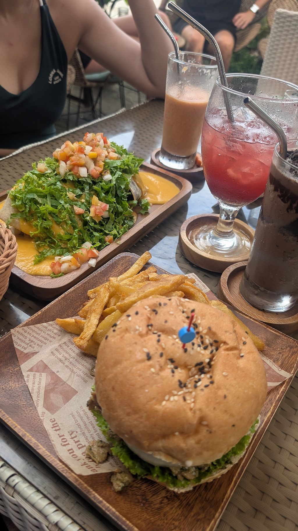 Cute outdoor restaurant, beachy island vibe. We had the chicken adobo (pretty big portion), Asian twist fries (big enough for a meal), the teriaky burger (not too big) and the pancit bami (huge portion), all to die for. Their banana bread was also out of this world. We didn't have luck with the American Big Breakfast, it wasn't good at all and the portion wasn't big either.