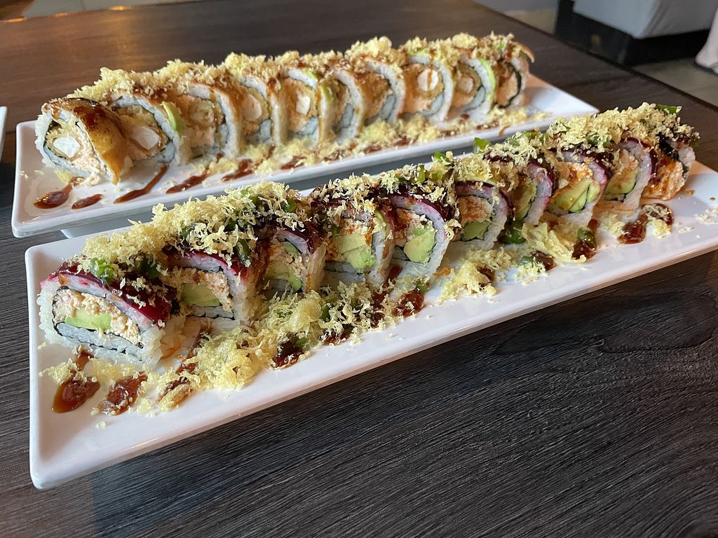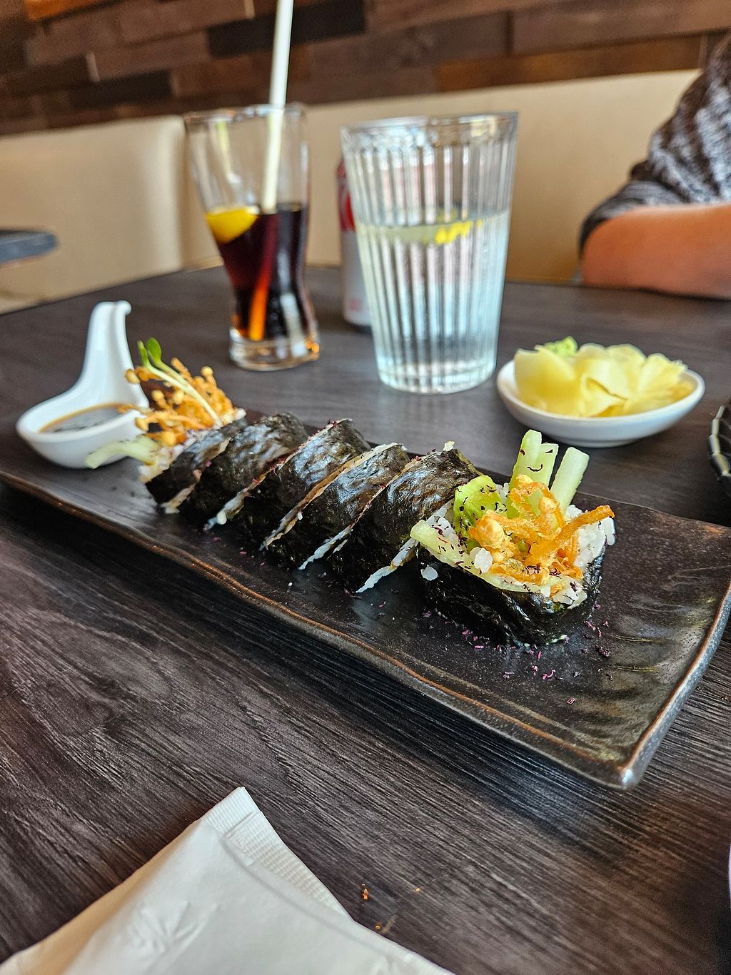 We stopped in on the way to a gig and took out Rainbow Rolls, Crunch Rolls, California Tempura Rolls, Seaweed Salad and Cucumber Salad. All were divine! Having stopped eating animals when I was a kid, I don't think I've ever tried the fishy variety. Having a giant menu with everything edible was like a carnival. My daughter and husband equally enjoyed the feast. Next time, we'll probably eat in. The people were friendly and the ambiance was inviting.