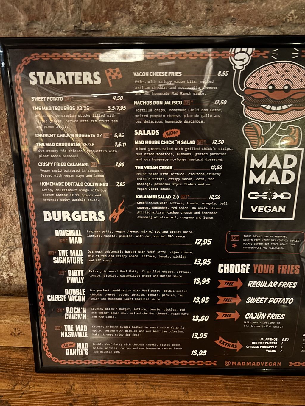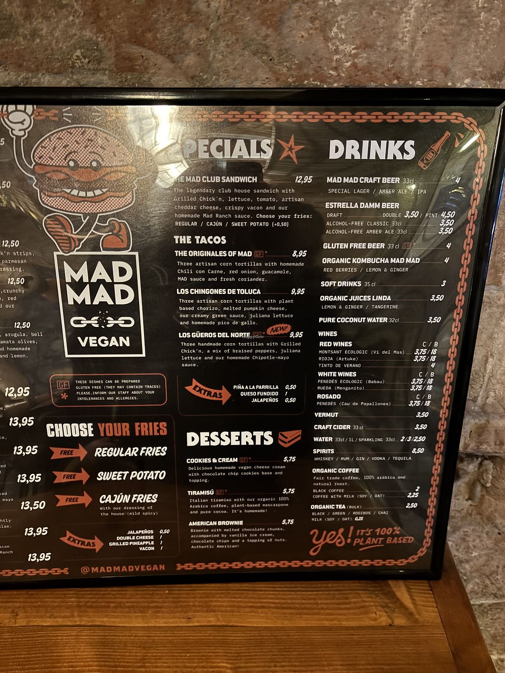 Amazing fake beef and chicken burgers, the Cajun fries and Mad sauce are great too. Will always stop by when visiting Barcelona or Madrid.