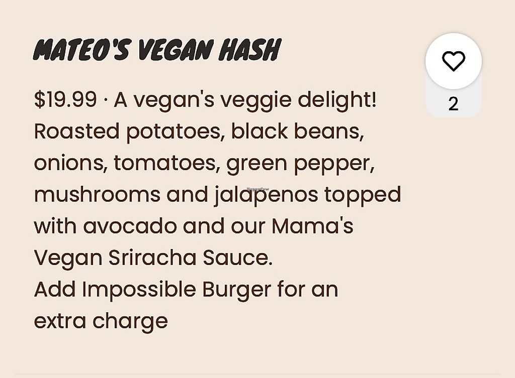 Lacto Ovo American Non-veg Serves meat, vegan options available. Offers two vegan dishes: Mateo’s vegan hash for breakfast and Cayla’s vegan sandwich. Open Mon-Fri 8:30am-9:00pm, Sat-Sun 8:30am-10:00pm. More