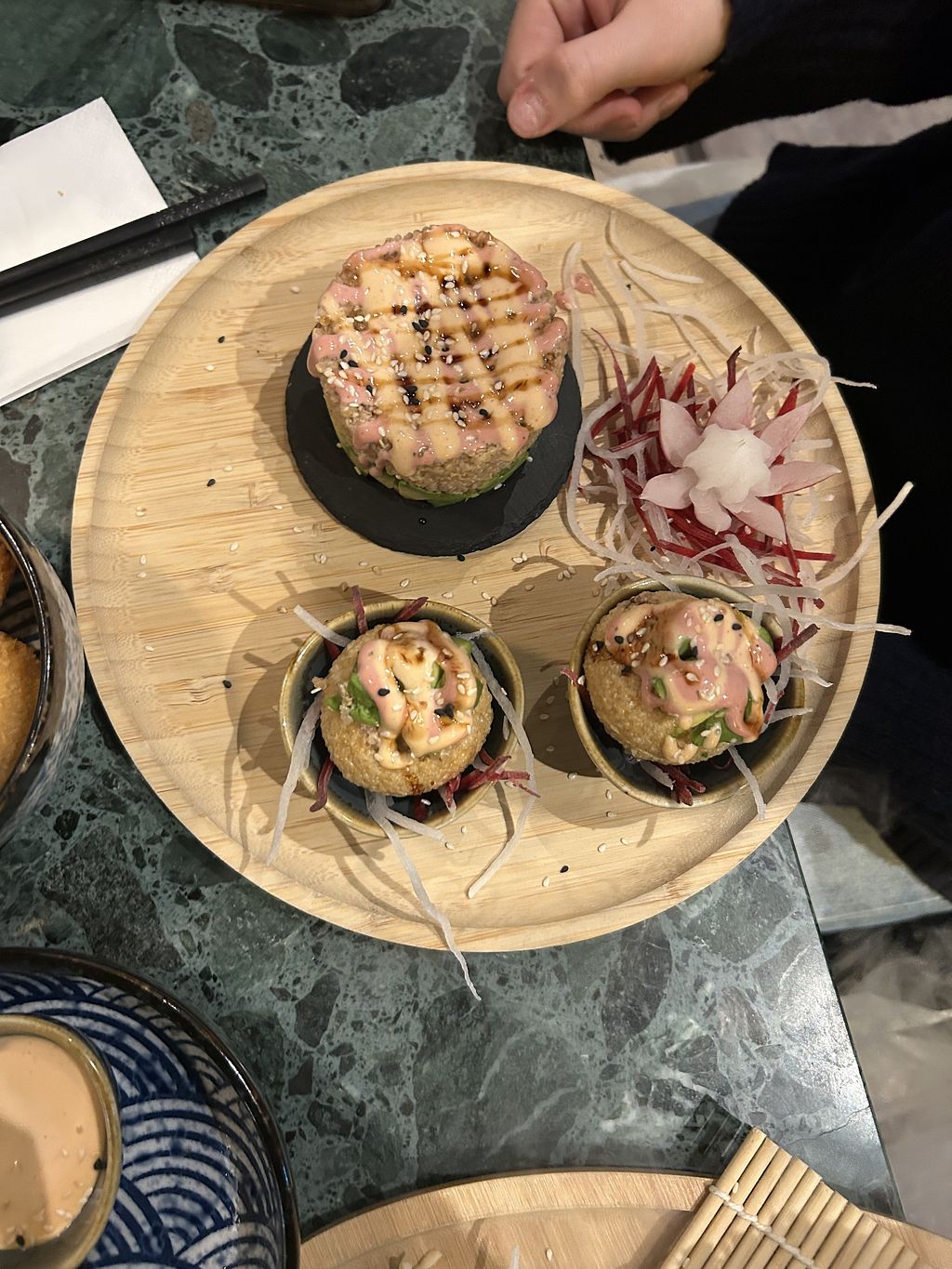 We were there with a group of five. We ordered 10 different tapas and some sushi (8 pieces) to share.