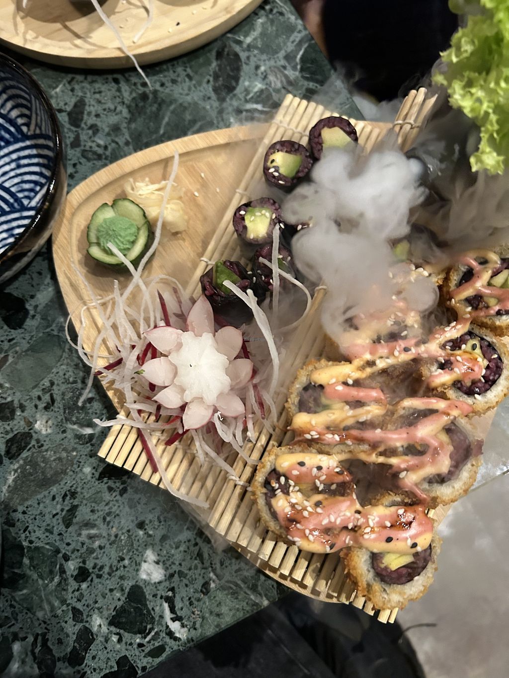 The extra sushi was a good idea as well, they put some liquid nitrogen (I think) so that you get fog on the table and it looks really cool!!