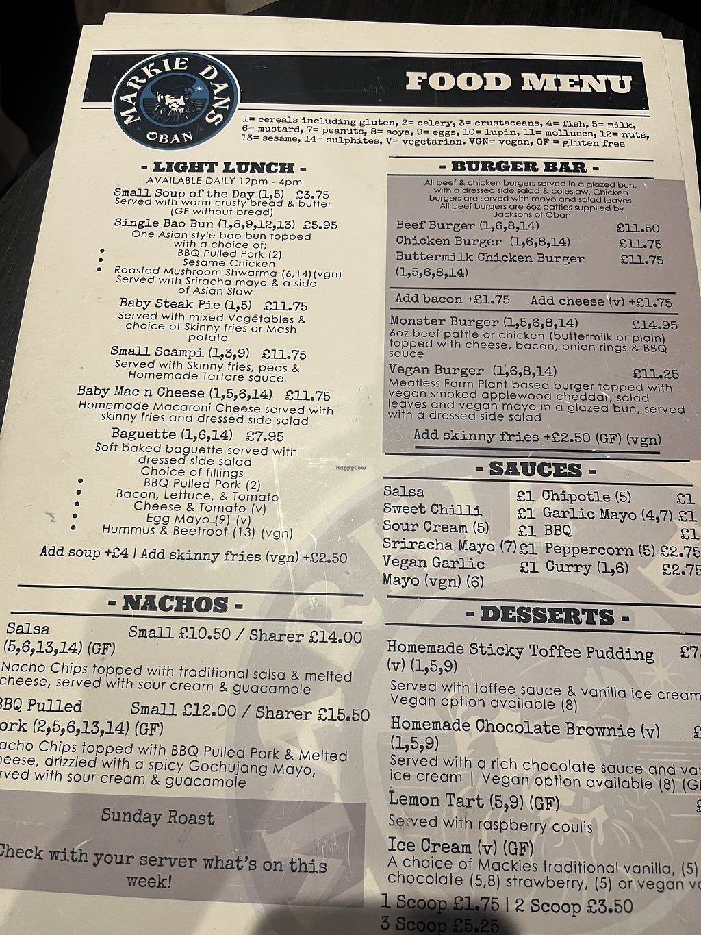 There were plenty of vegan options which were clearly marked on the menu. My friend and I shared the cauliflower wings as starter, I had the vegan Burger and my friend the vegan Bao buns. Although my friend is not the biggest fan of tofu, she really enjoyed the buns! All three dishes came with plenty of vegan mayo. My highlight was the vegan toffee! It was full of flavor and they let me choose between cream, vanilla ice cream or a vanilla sauce (all vegan). There were more vegan options on the menu (for some see the pictures of the menu, but not all are included). I did not expect to have such a dinner in Oban and was really happy!